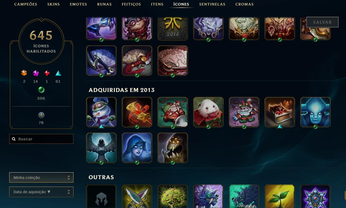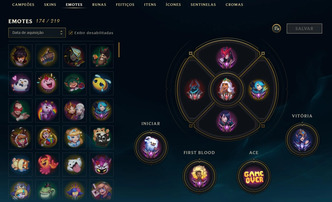 Dono unico, conta de colecionador, Todos os campeões, Todos os dados, nenhum banimento desde 2013, 172 emotes, 642 icones , 43 skins de sentinela sendo 5 delas míticas e uma delas a da riot de 2013 , Todas as vitoriosas desde a Morgana, 70 chromas, 724 Pontos de maestria, 28 M7, 28 M6 , 33 M5 . Muitos emblemas de Maestria nos espólios, pelo menos maestria 2 com todos os campeões do jogo