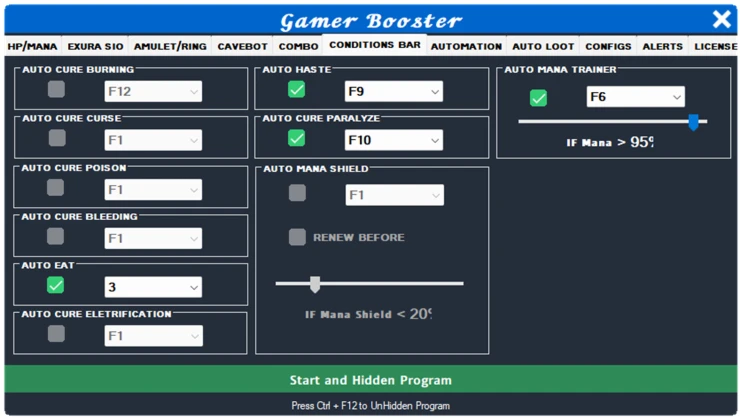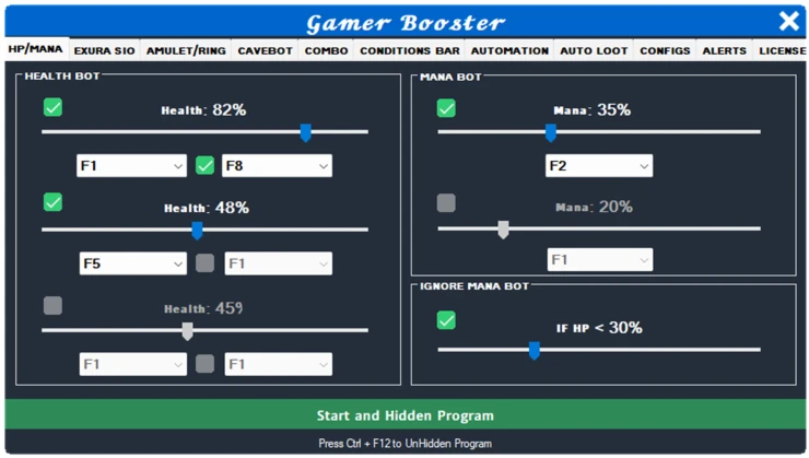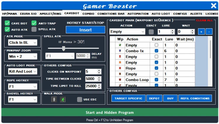 Também temos um sistema de Refil em nosso Cavebot, permitindo que você condicione a saída da cave quando estiver com menas que "x" potions, ele sai da cave, vai para o depot, deposite os itens pré-configurados por você, vai no NPC de potions e compra as potions que você pré-configurou no Bot, tudo de forma 100% automatizada e humanizada.