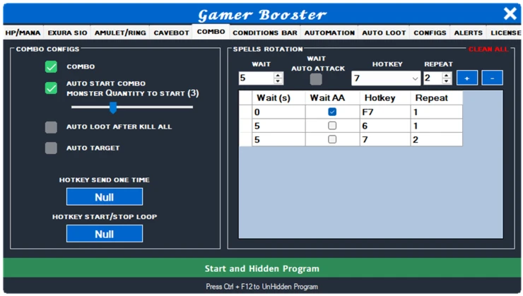 para garantir a segurança do sistema. O sistema de combo possibilita também ativar a opção "Wait AA" para cada hotkey pressionada, onde a hotkey só será pressionada quando um auto ataque for feito no monstro targetado atualmente.