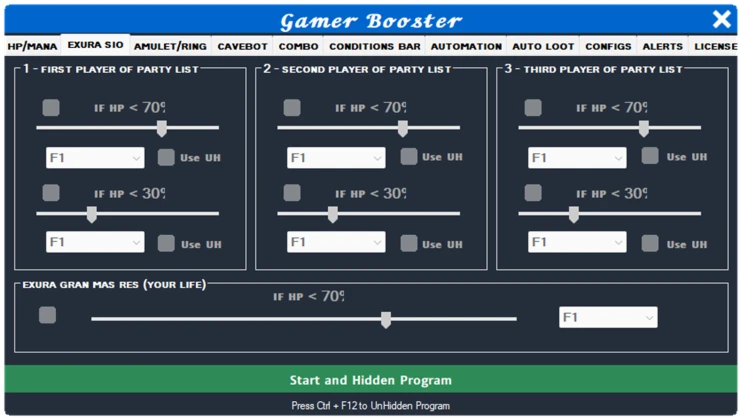 Com o Exura Sio você consegue automatizar o exura sio, exura gran sio, exura tio sio e uso de UH em amigos, ele funciona através do party list, bem fácil de configurar e muito eficiente para caçar em grupos, essa função deixa a vida dos druids, sorcerer e monk muito mais tranquila e prazerosa de jogar.