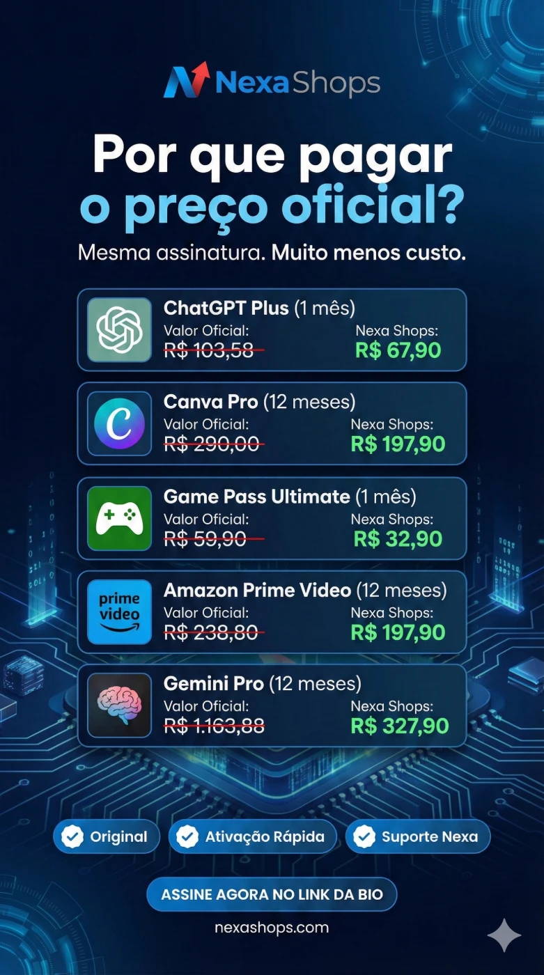 Chega de "contas compartilhadas" ou gambiarras que caem toda hora. Compre com a Nexa Shops e tenha a tranquilidade de um produto 100% original.