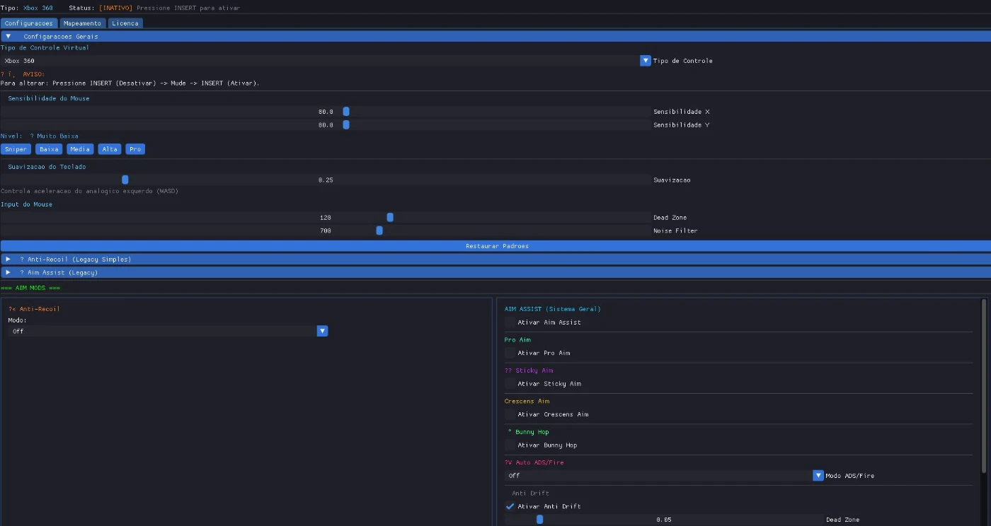 - Aim Assist configurável com múltiplos modos