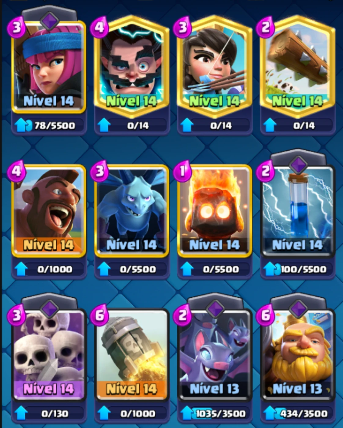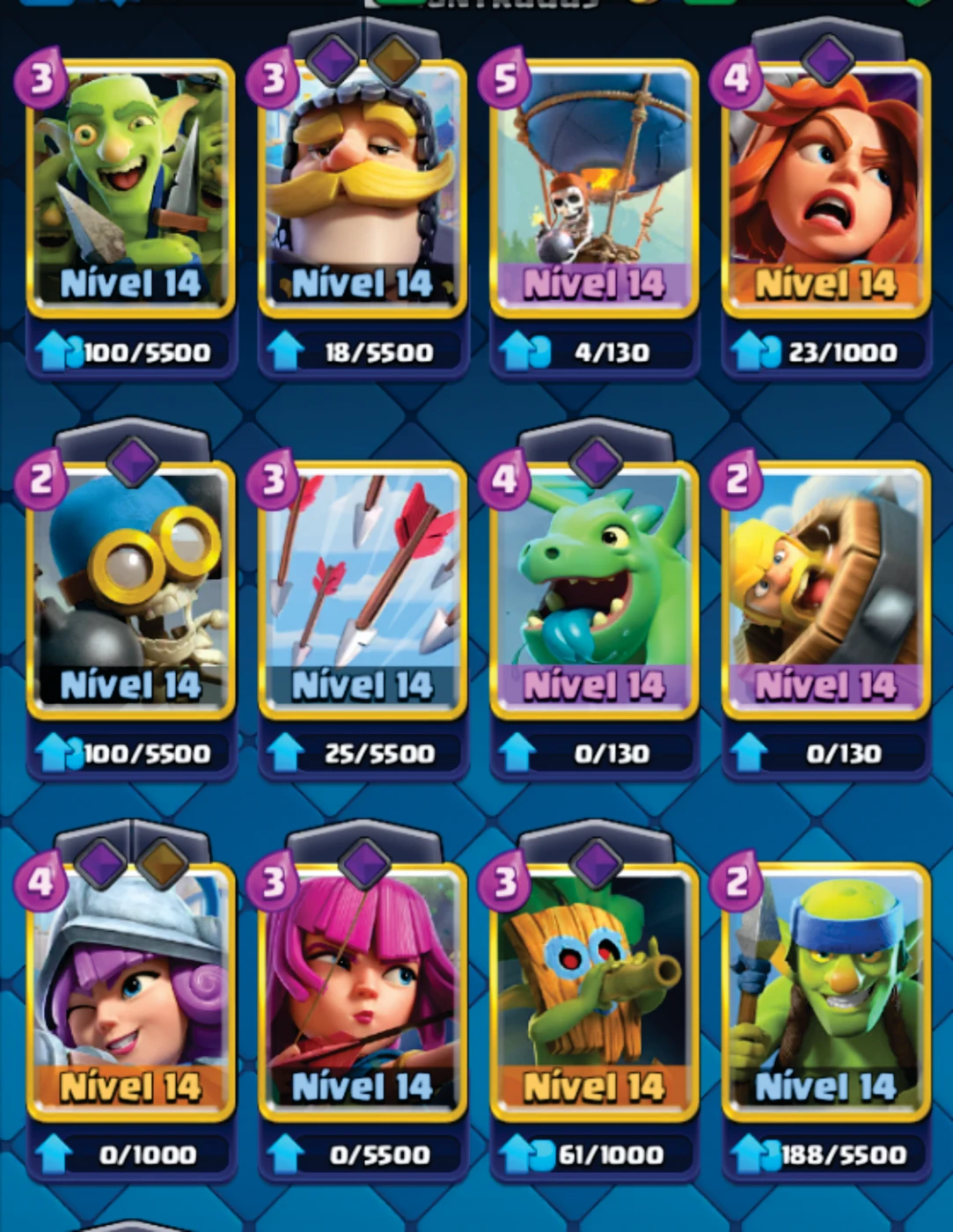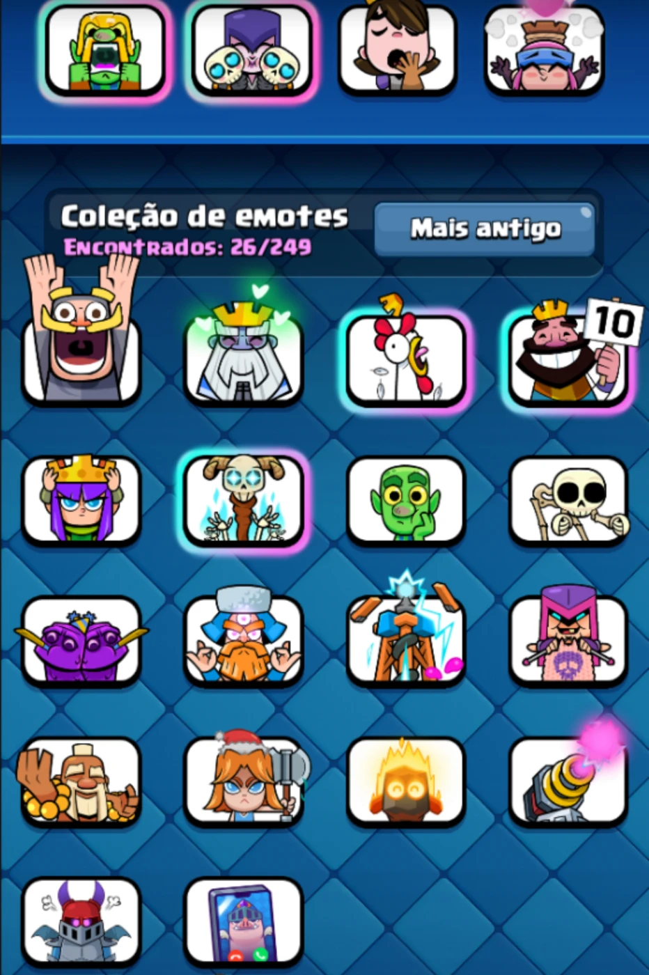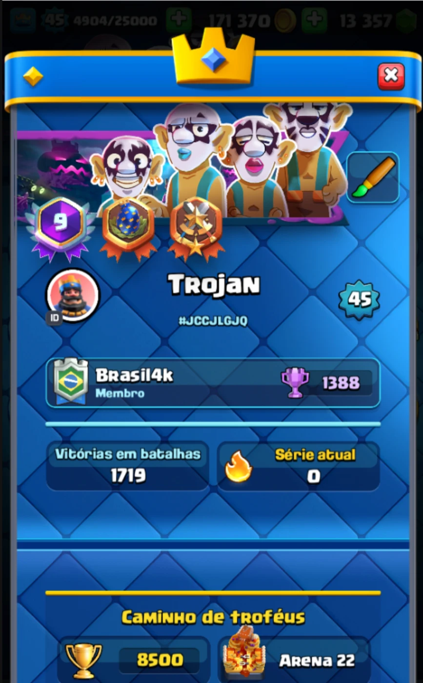 Conta criada no mesmo ano de lançamento do jogo, tem medalha de 9 anos, esse ano completa 10 anos, conta líder de clã, 13k de gemas, 100k de gold, 8500 troféus, lvl 45