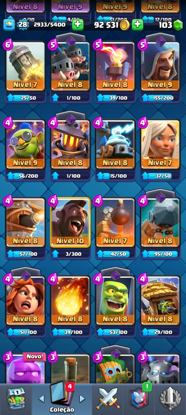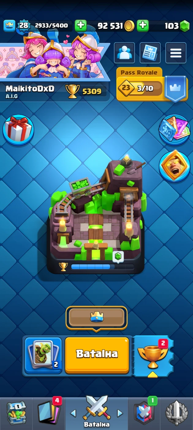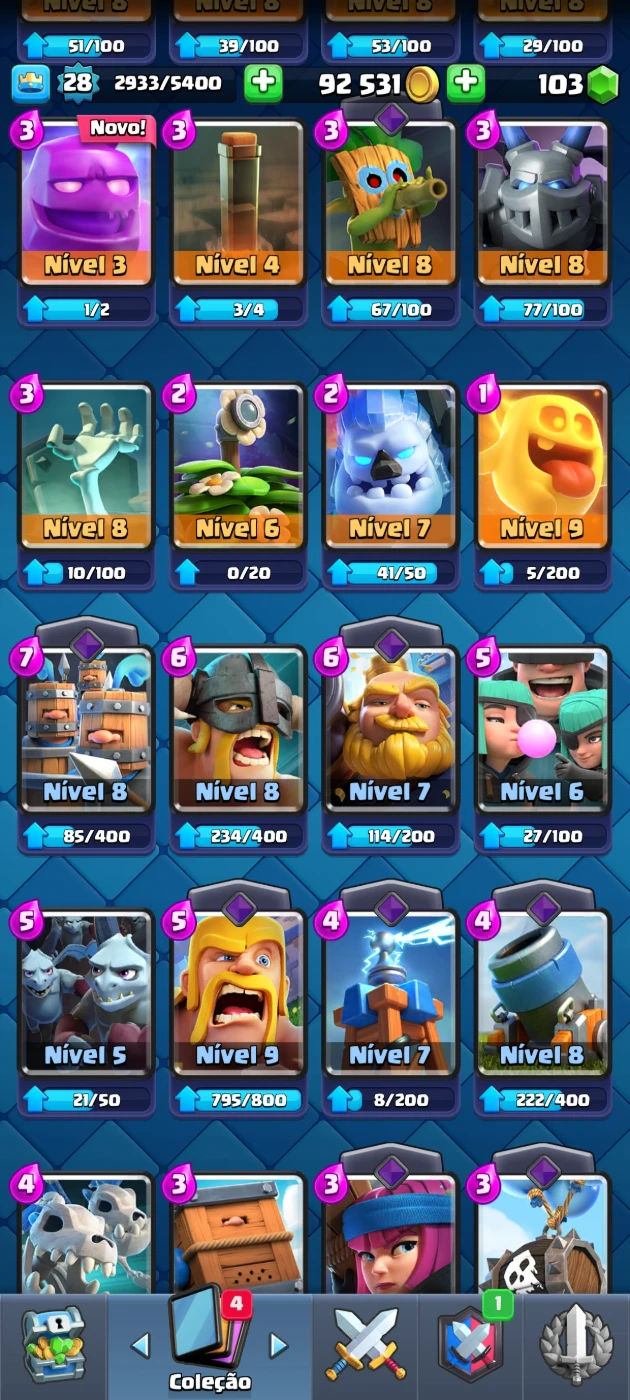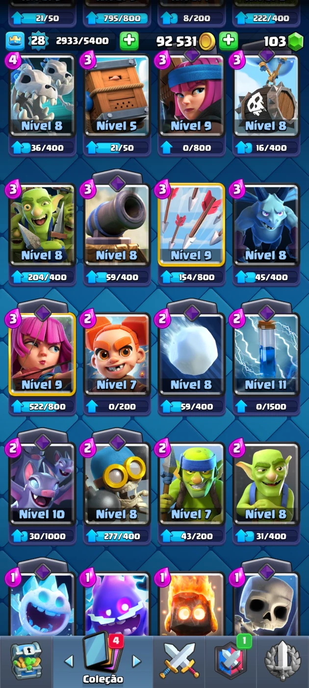 🏆 Troféus: 4463 🆙 Nível da conta: 24 💰 ouro: 87k 💚gemas: 91 🎯 Tropas da Torre: Princesa da Torre(Nível 10) 🃏 total de cartas: 100 cartas com 12 lendarias 📊 Algumas Cartas: fantasma real, o tronco Princesa, Mineiro(Nv.9), Sparky, etc...