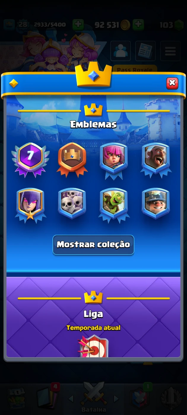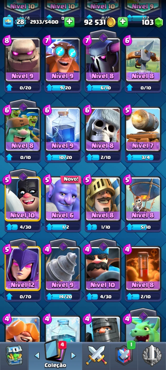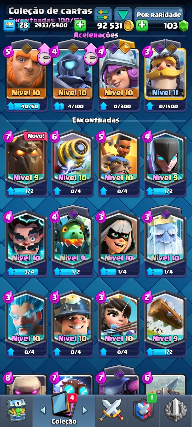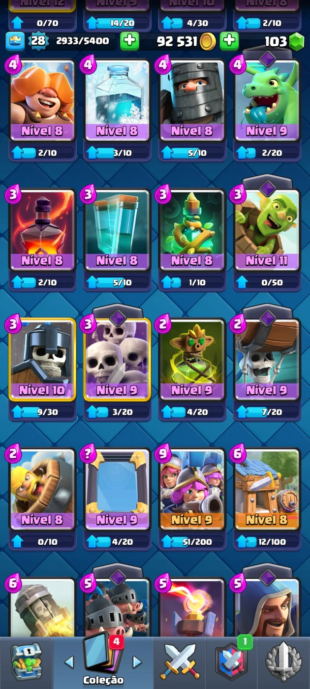 🏆 Troféus: 4463 🆙 Nível da conta: 24 💰 ouro: 87k 💚gemas: 91 🎯 Tropas da Torre: Princesa da Torre(Nível 10) 🃏 total de cartas: 100 cartas com 12 lendarias 📊 Algumas Cartas: fantasma real, o tronco Princesa, Mineiro(Nv.9), Sparky, etc...