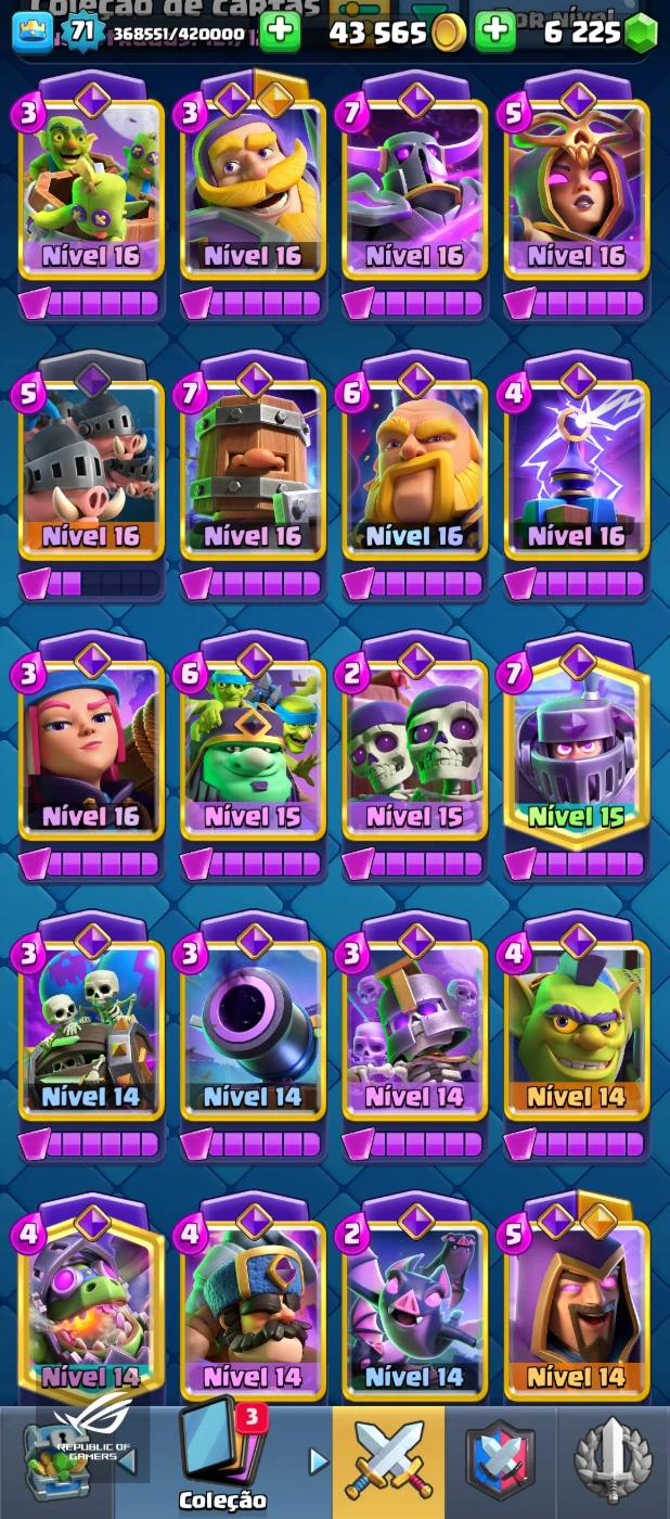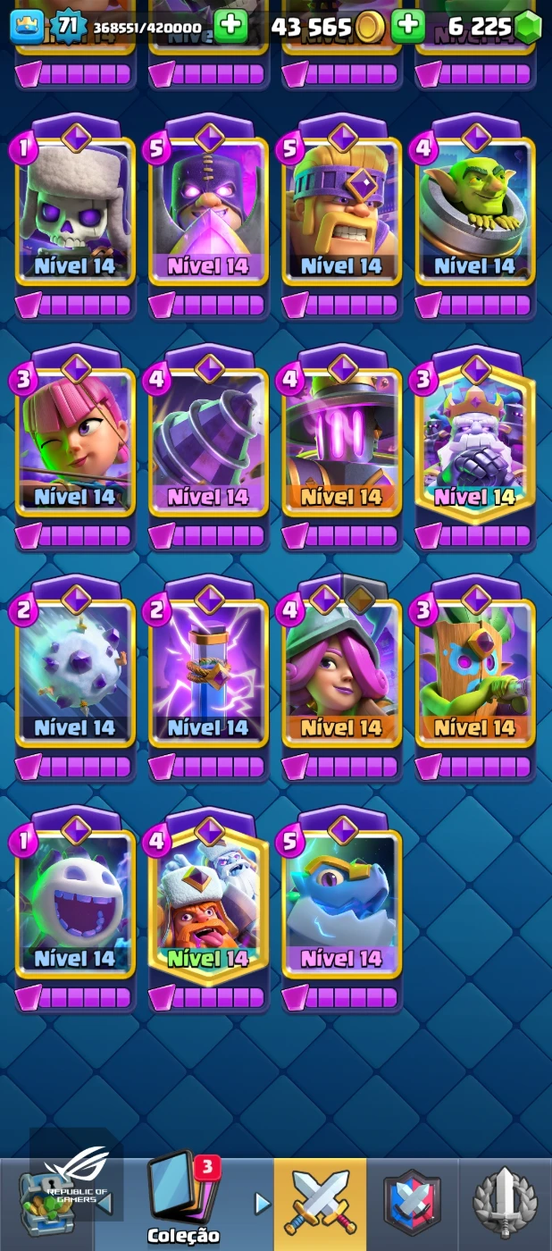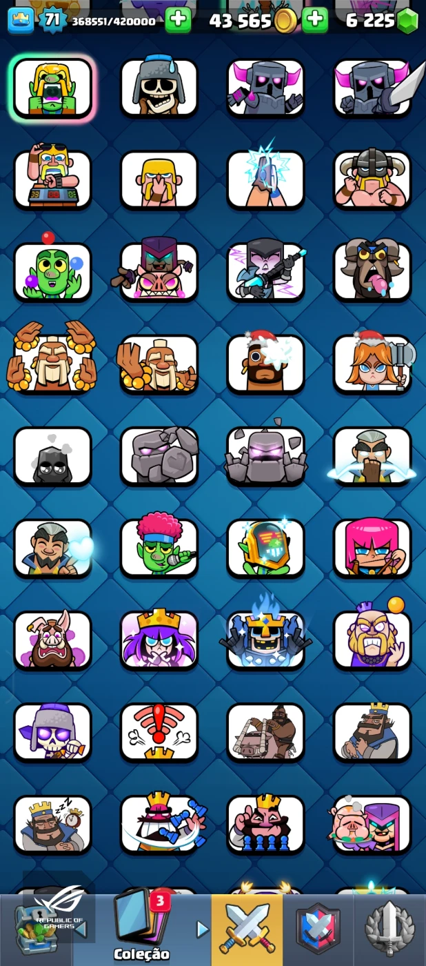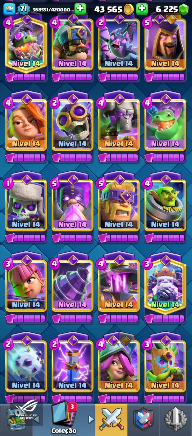 Conta muito boa no level 71 com mais de 11mil trofeu e 6225 gemas. dês do pass Royale Valquíria, eu atualizo o pass Royale todos meses até o de setembro (dragão bebe).o unico pass royale de evoluçao que nao comprei foi o do porcos reais. as novas de forma heroica comprei ate a do mago. a atual desse mes nao esta comprada.