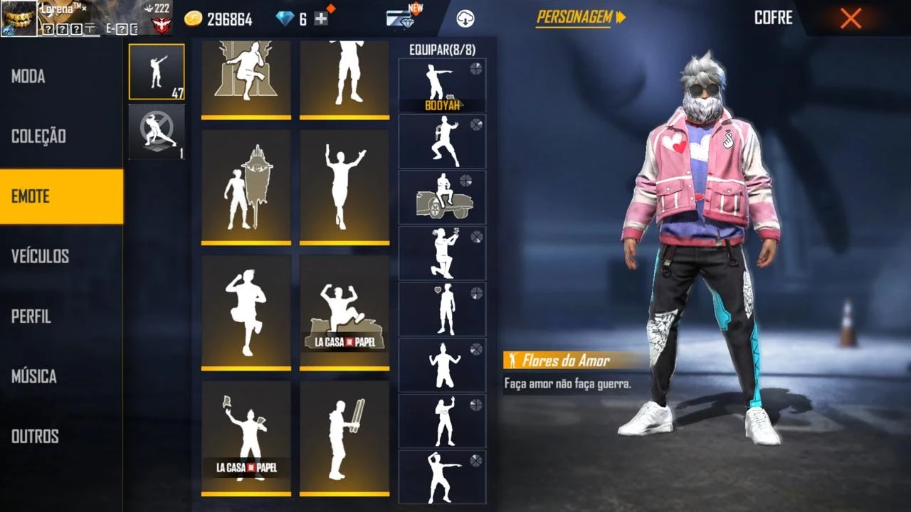 Mascara da caveira, barbinha, bandeirão e vários emotes daora.