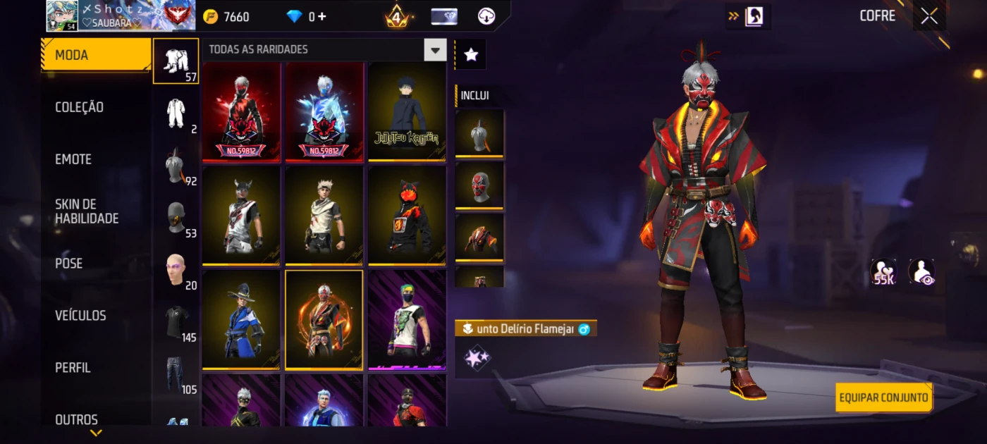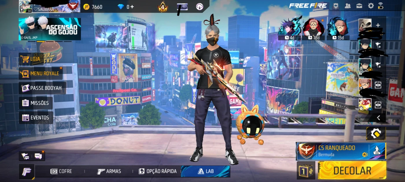 Conta com passes atualizado, angelical vermelha feminina já tem skin da parceria o Megumi junto com o emote da parceria tem uma arma evolutiva nível 5 e um punho tem skin evolutiva vários peitorais e calsas tem a calça Dawn também e várias coisas por um preço muito bom a conta e prime 4 e tem várias outras coisas disponíveis na conta, conta via Google já aproveita essa promoção!