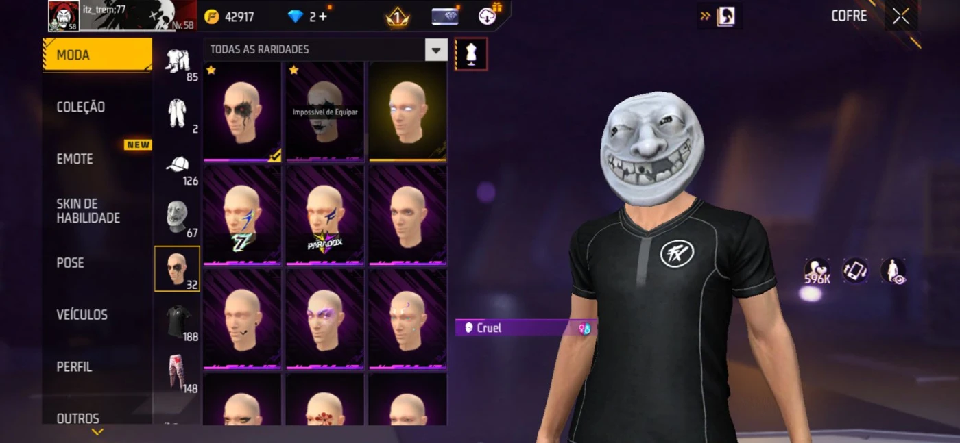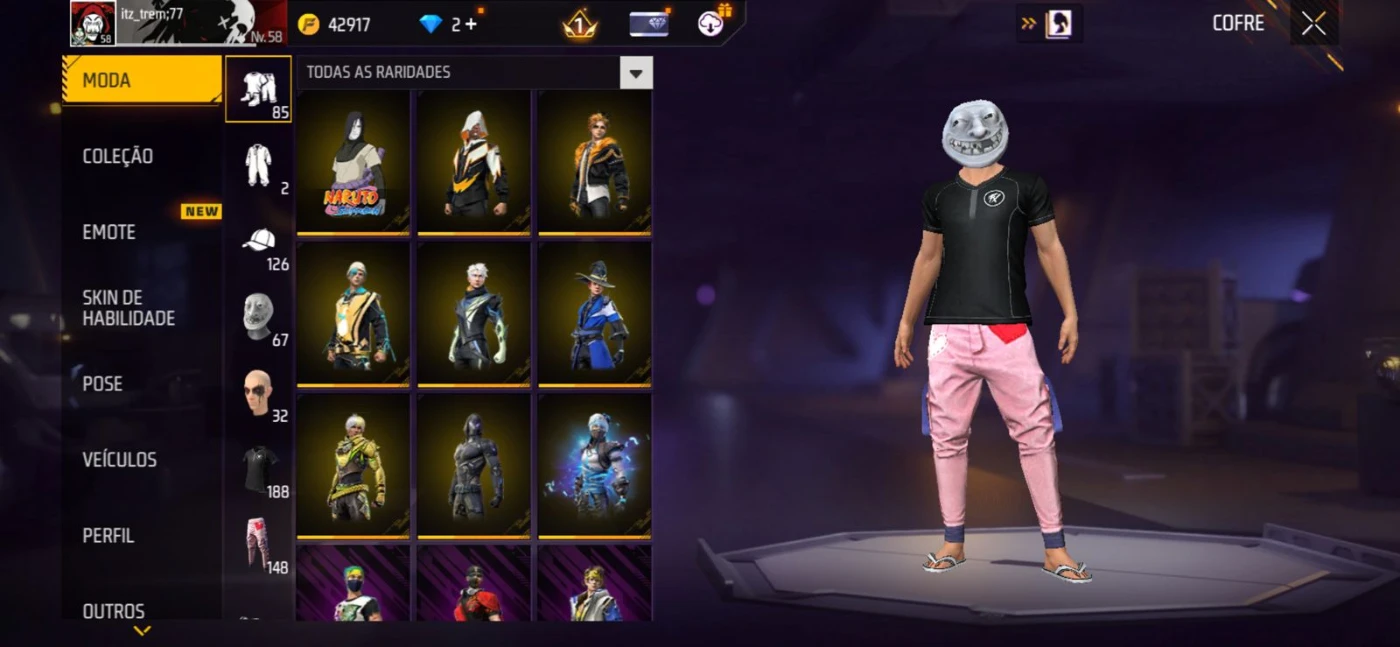 Conta bem equipada, com itens raros e exclusivos, ideal para quem busca estilo, raridade e diferencial no lobby.