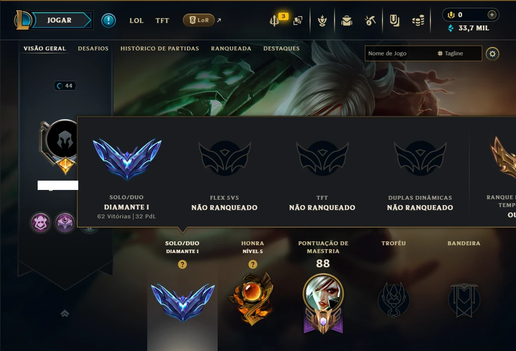 Diamante 1 com 45 Champs e 7 Skins - League of Legends LOL