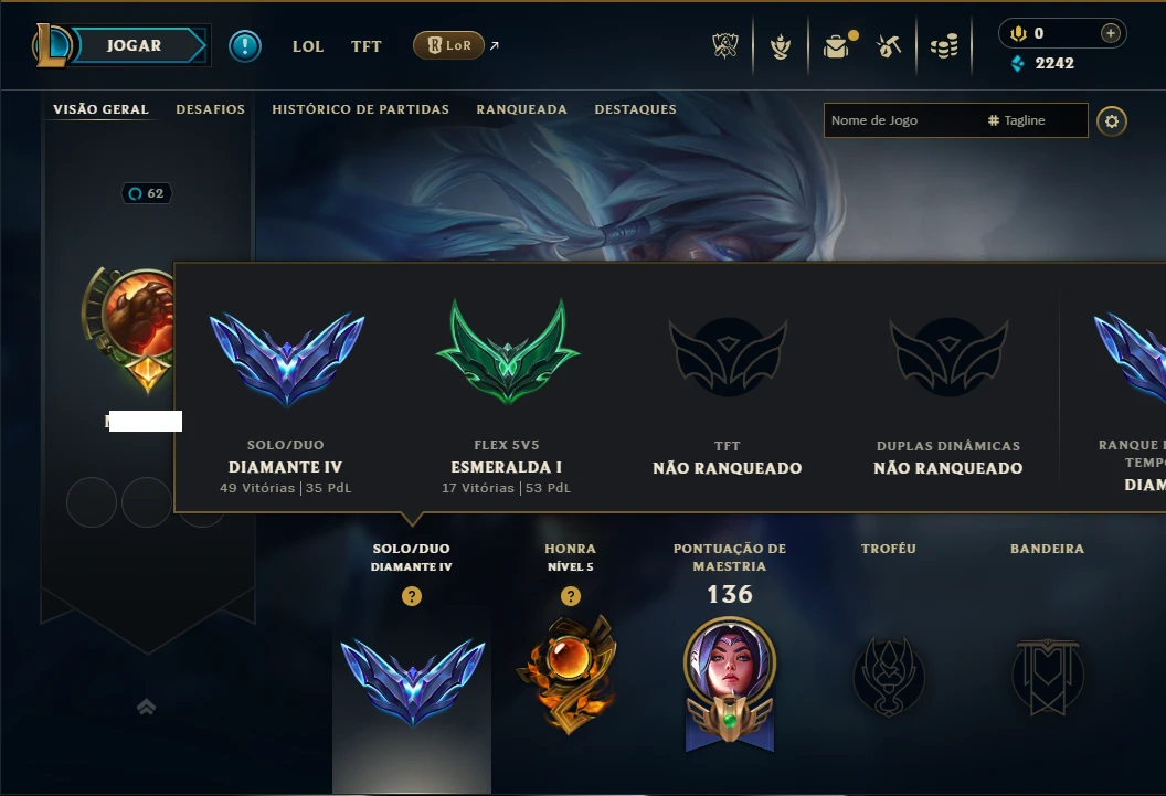 Diamante 4 com 95 Champs e 23 Skins - League of Legends LOL