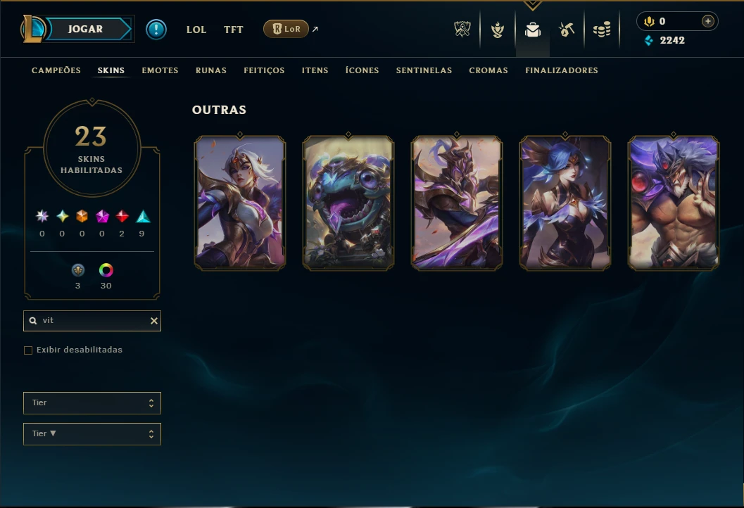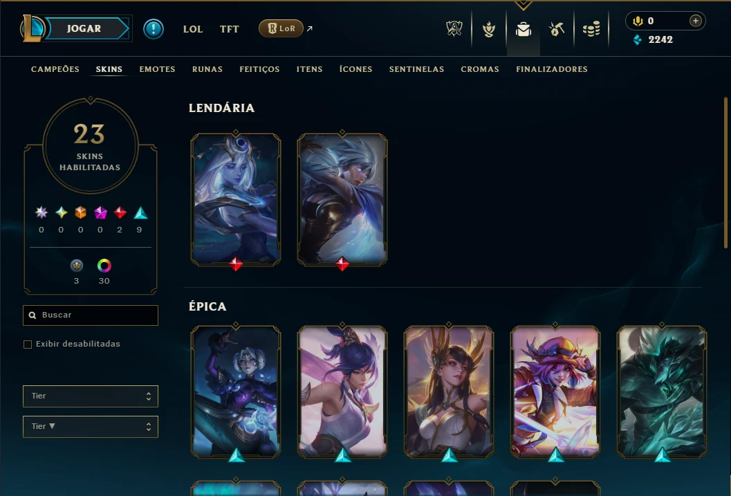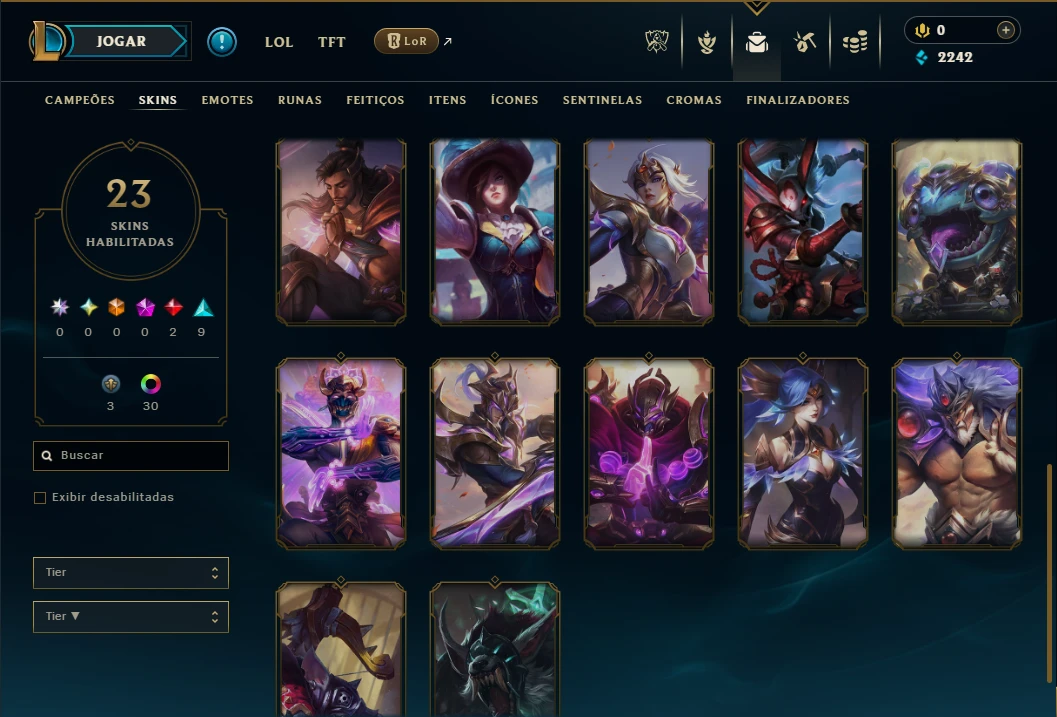 Conta Diamante 4 com 95 Champs e 23 Skins, 5 Vitoriosas, 30 Cromas, 68 Ícones, 33 Emotes, 2 Fragmentos de skins, 2 de Campeão, 3 Reembolsos e Honra 5.