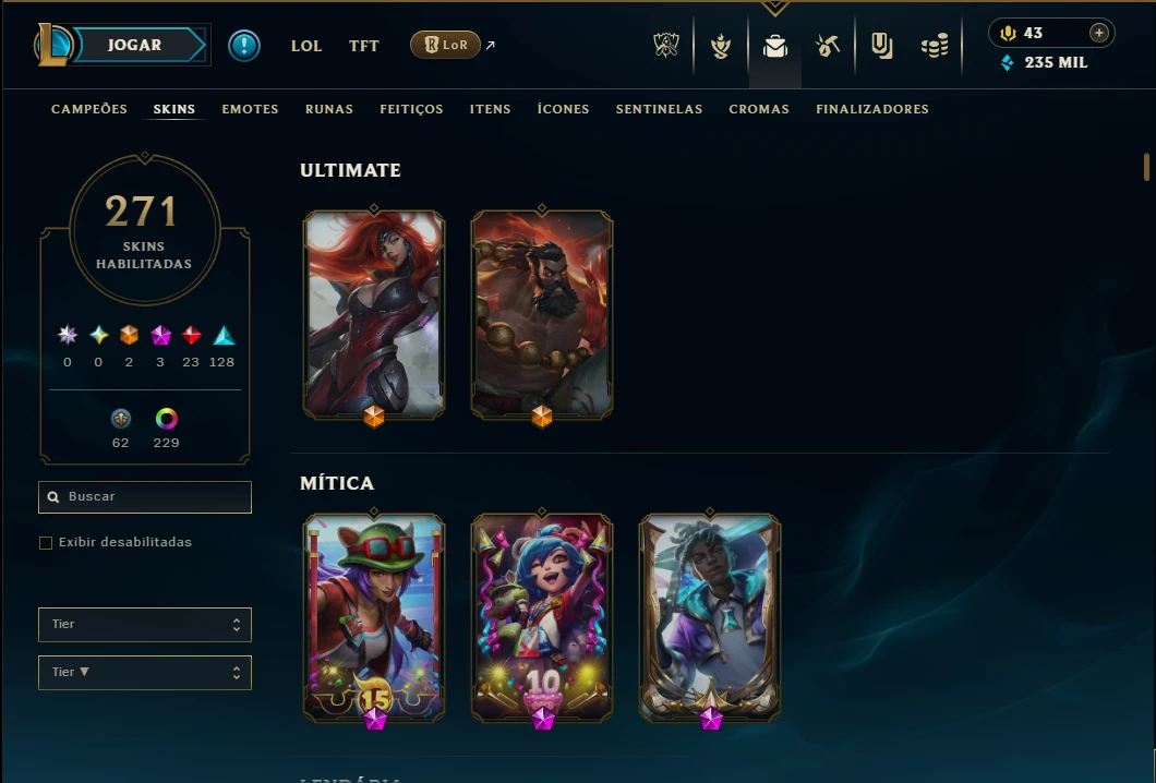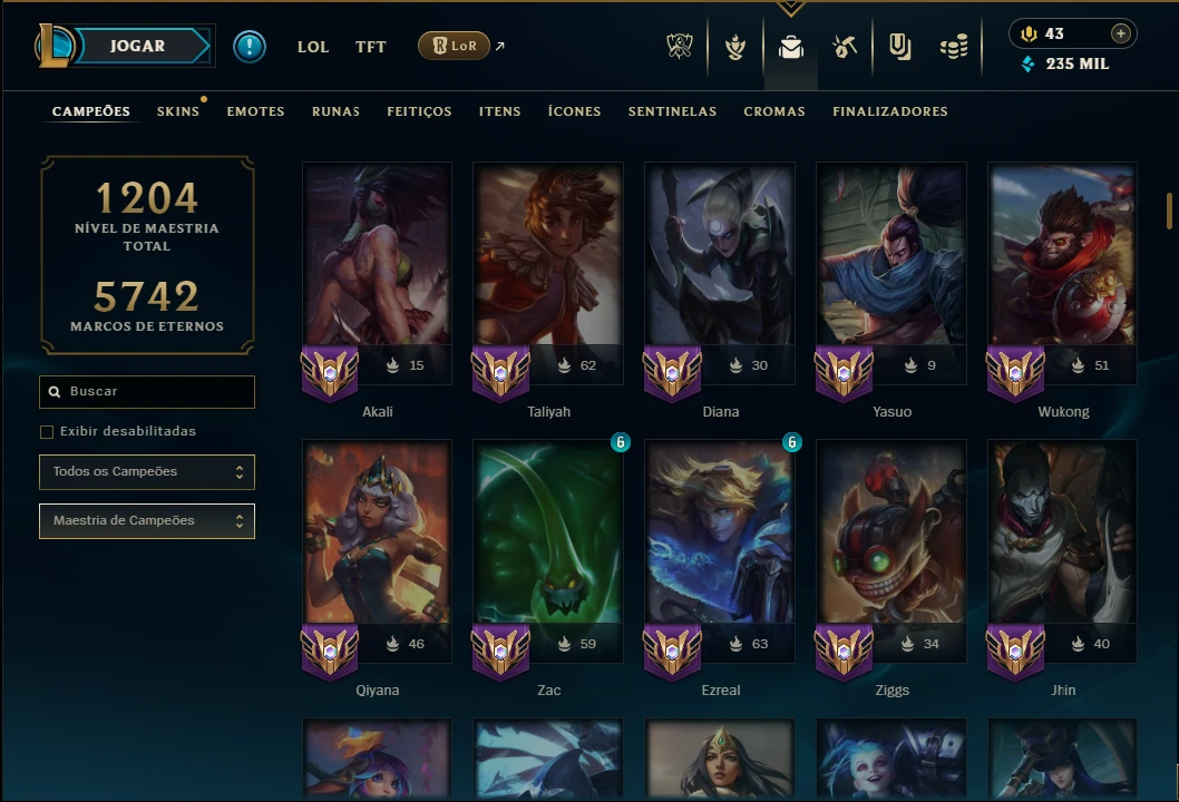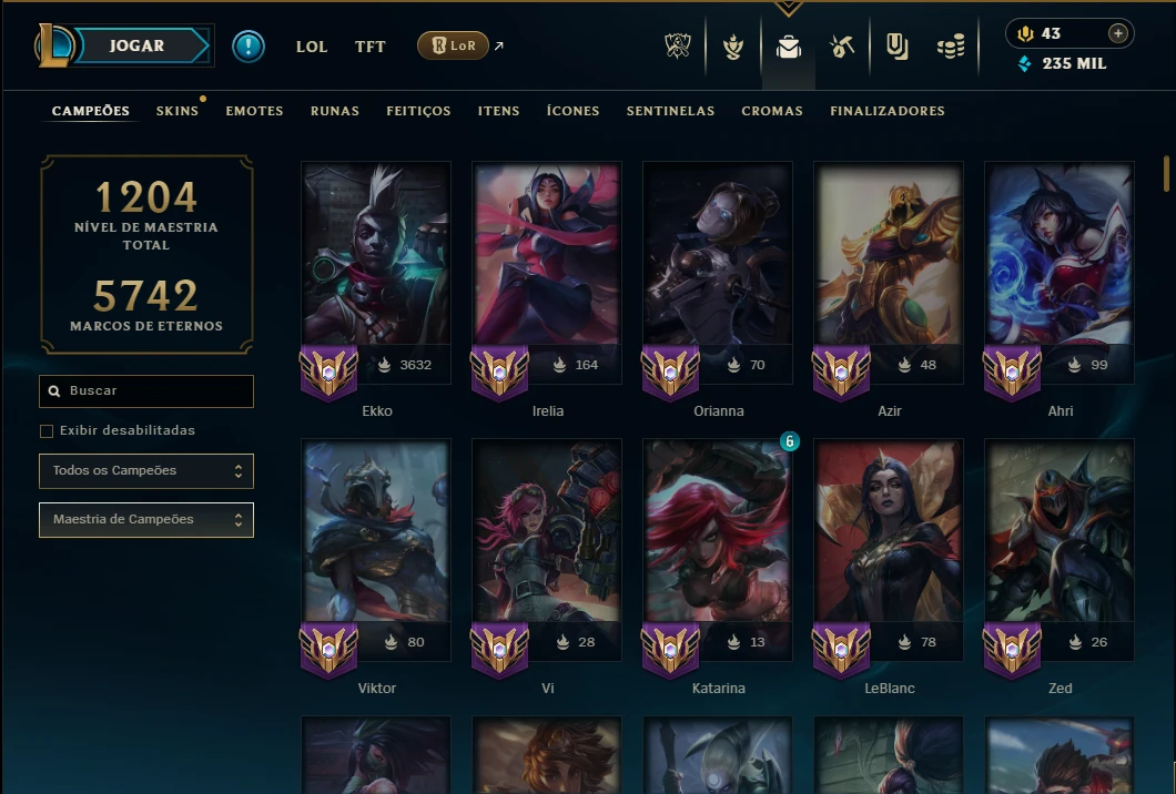 Diamante 4 com TODOS os Champs e 271 Skins ( MID / JG )