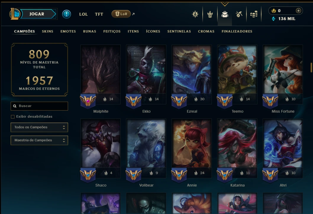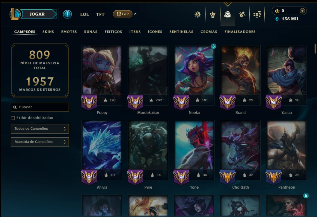 ( Nivel 643 ) - Conta Esmeralda 1 com TODOS os Champs, Maestria 26 de Poppy, 22 de Mordekaiser, 21 de Neeko, 11 de Brand, 11 de Yasuo, 30 Maestrias acima de 7, 175 Skins, 2 Miticas, 9 Vitoriosas, 136k de EA, 139 Cromas, 344 Ícones, 331 Emotes, 90 Essencias Miticas, 3 Reembolsos e Honra 5.