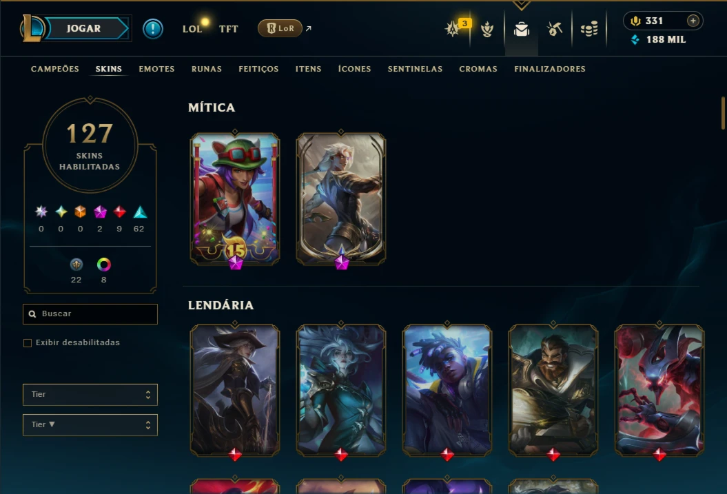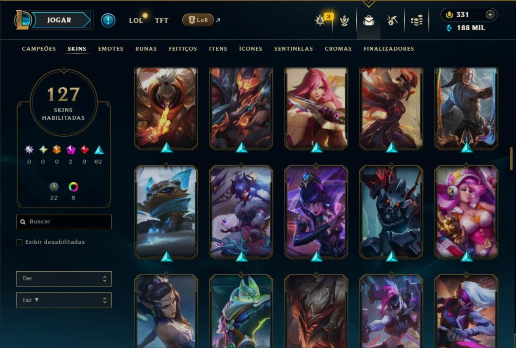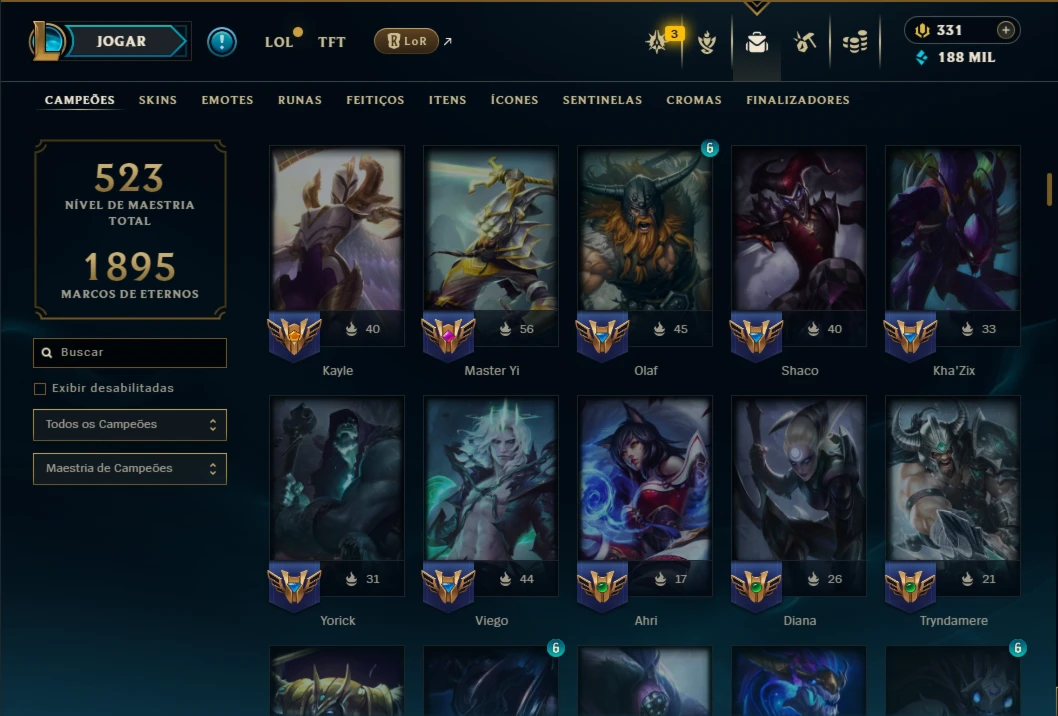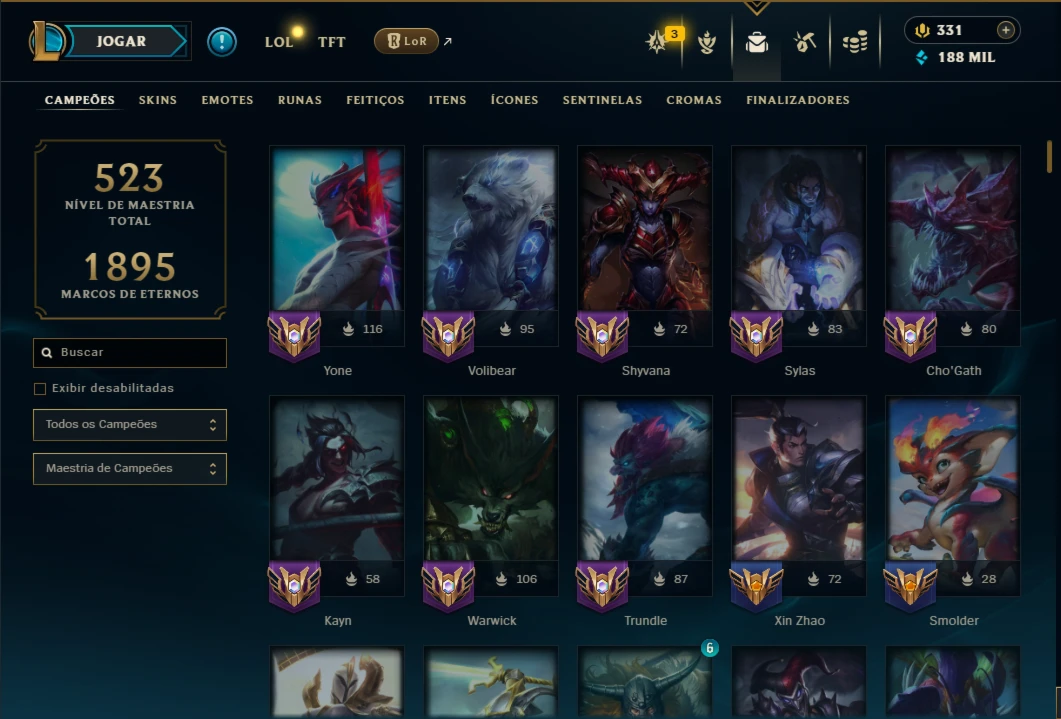 ( MID / JG / TOP ) - ( Nivel 454 ) - Conta Ferro 3 com TODOS os Champs, 17 Maestrias acima de 7, 127 Skins, 1 Prestigio do Kayn, 4 Vitoriosas, 188k de EA, 8 Cromas, 197 Ícones, 218 Emotes, 2 Fragmentos de skins, 25 de Campeão, 25 Essencias Miticas, 3 Reembolsos e Honra 4.