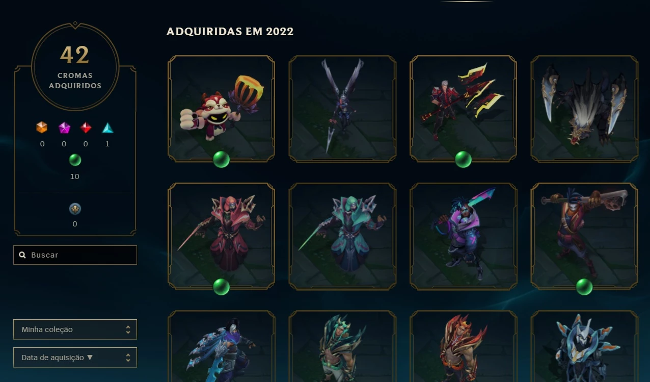 - 217 Skins habilitadas ( 1x Ultimate, 3x míticas, 19x lendárias, 103x skins épicas, 42x skins legado e 42 chromas de skin)