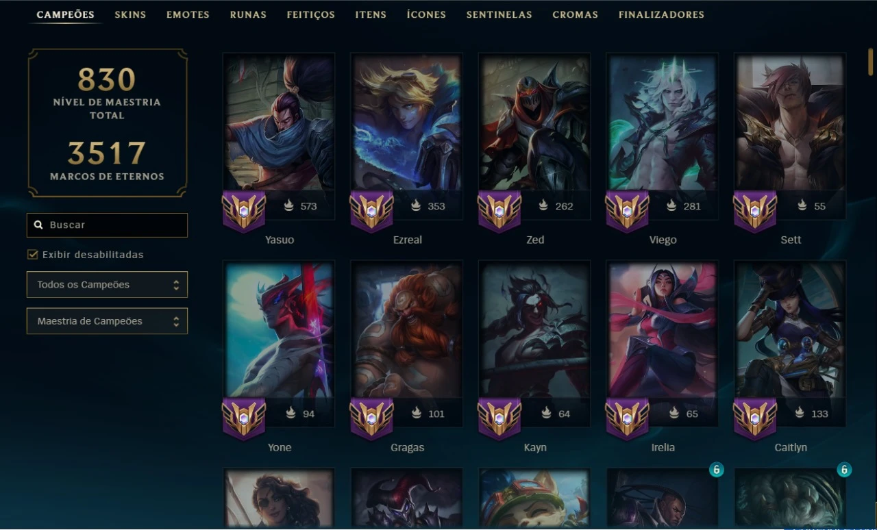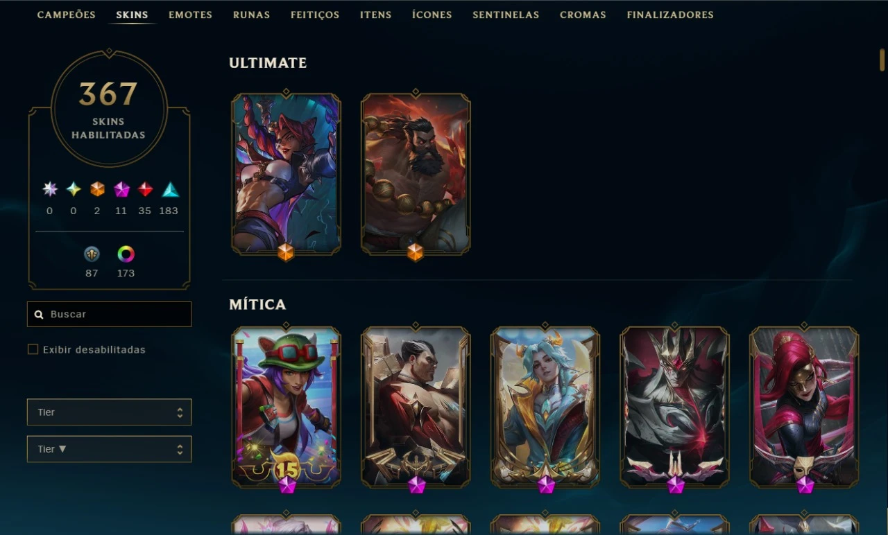 A conta possui todos os campeões do jogo habilitados, possui 367 skins, tendo 2 ultimates, 11 miticas, 35 lendárias e 183 épicas. A maior maestria da conta é com o Yasuo, tendo por volta de 1 milhão de maestria, possui maestria alta com Yone, Zed, Ezreal, Caitlyn, Lucian, Gragas, Sett, Fiddlesticks, Samira e por demais champions. Possui dados de criação, sou dono único e a intenção é a venda por enjoo do jogo. Elo atual é Platina, não jogo tem bastante tempo. A conta acompanha uma conta de valorant com um dos primeiros passes do jogo. Leva tudo junto dos dados de criação da conta.