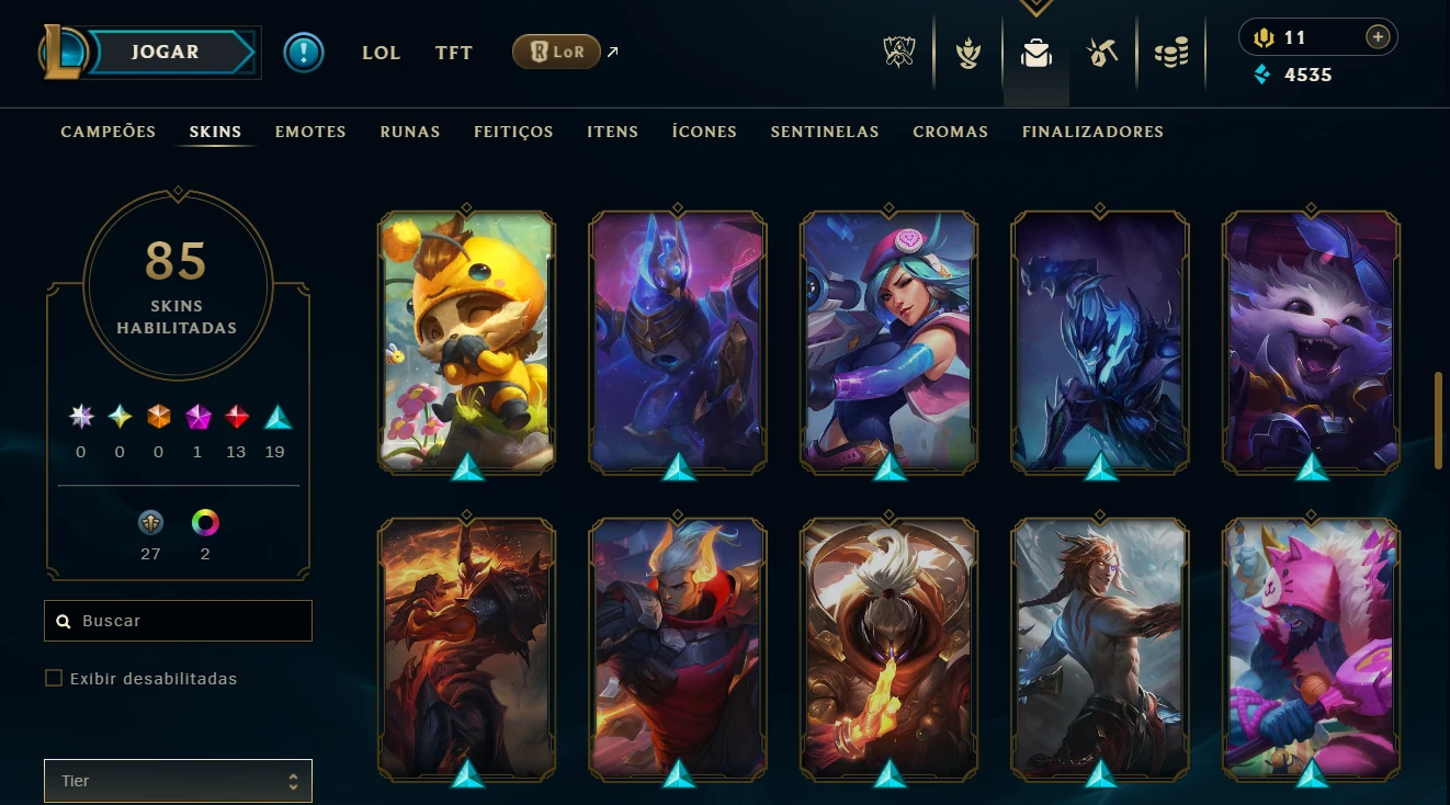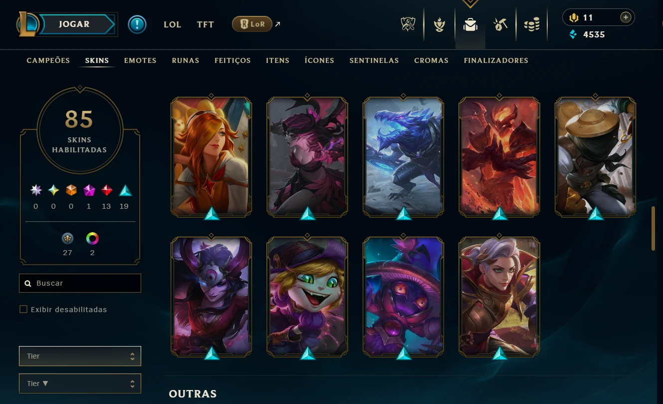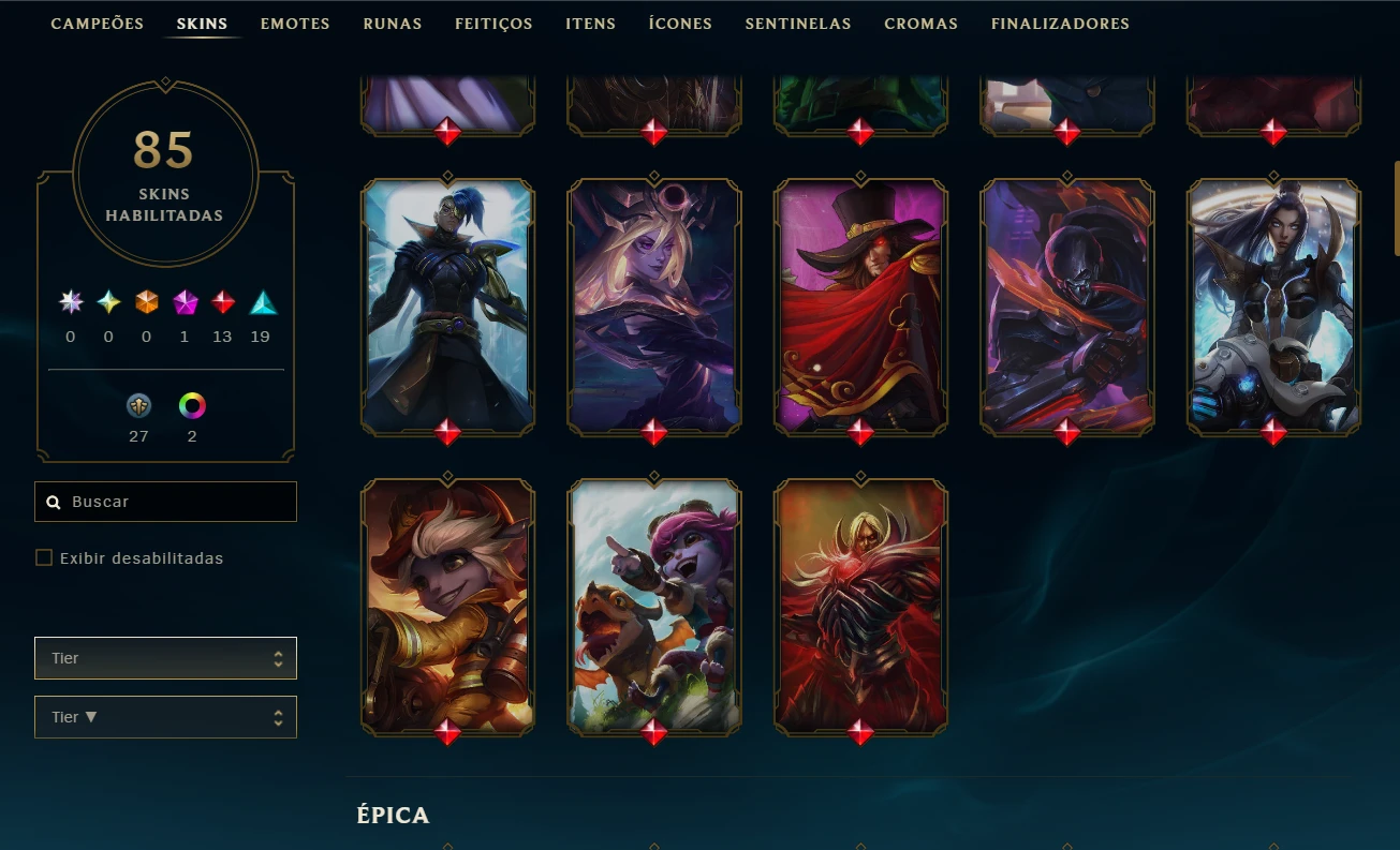 • Skins: 85 (13 Lendárias, 19 Épicas, 27 Legado)
