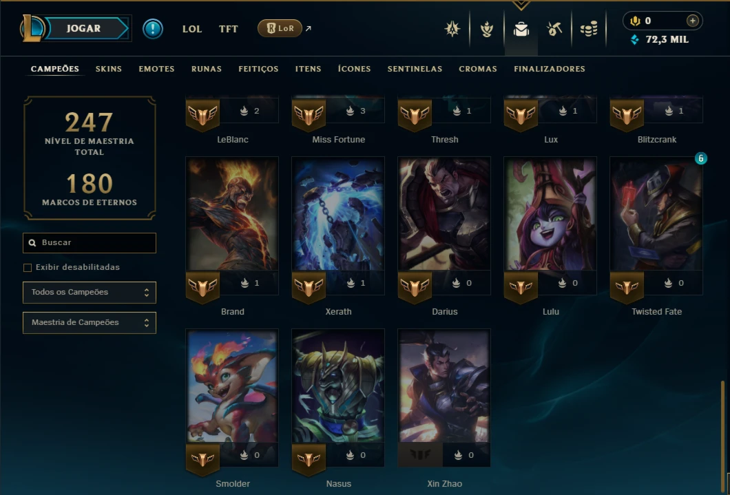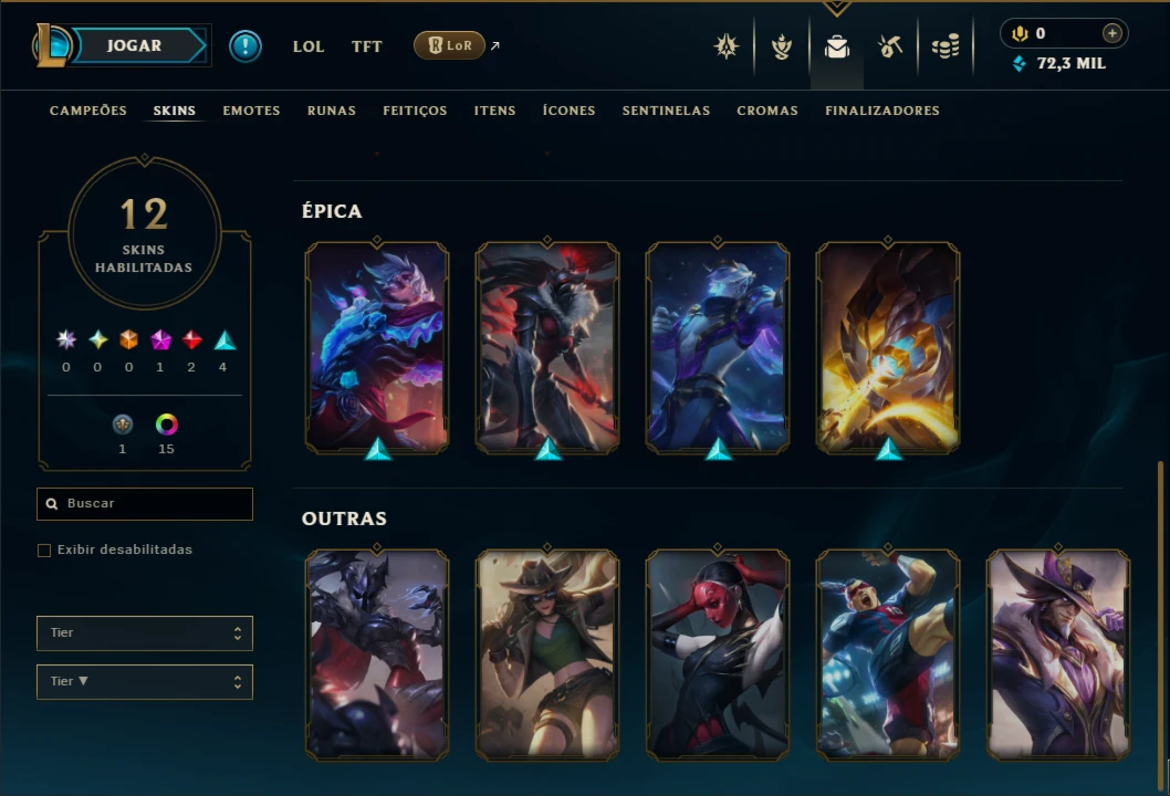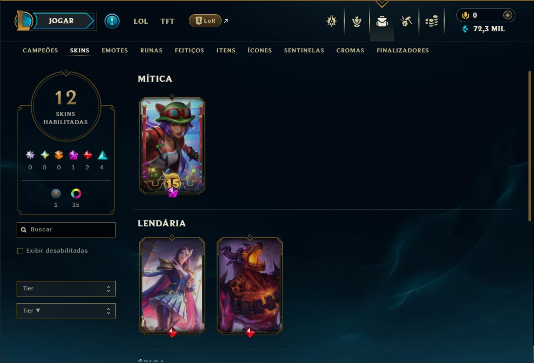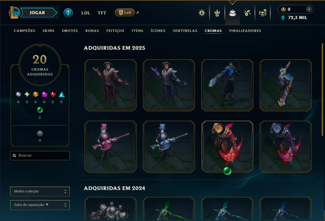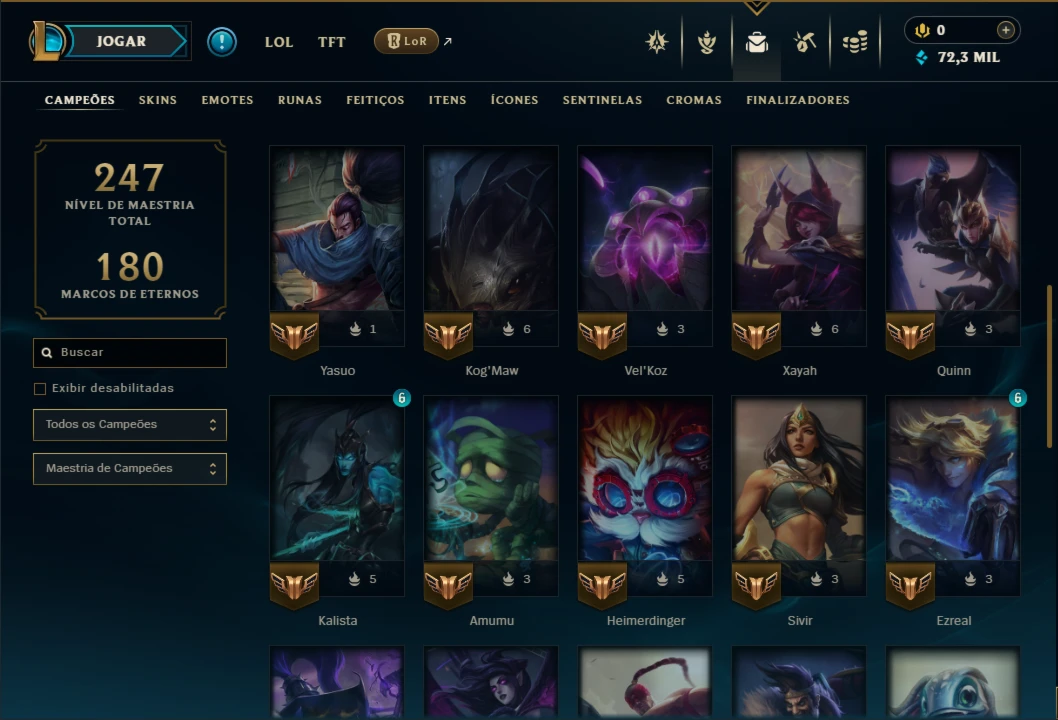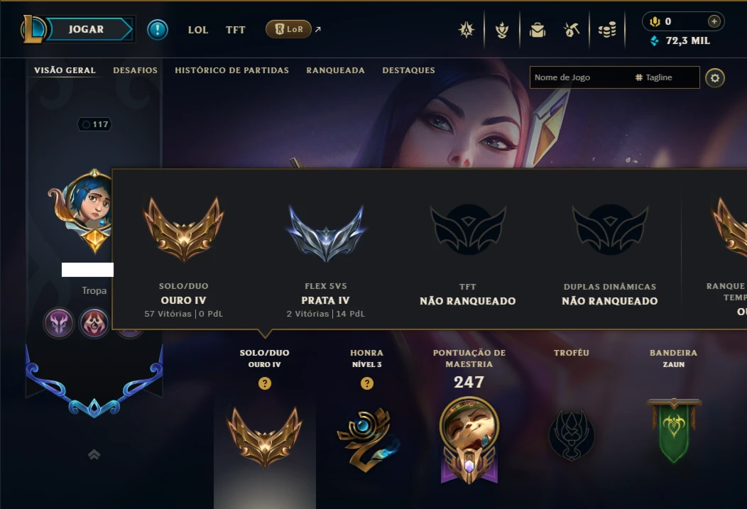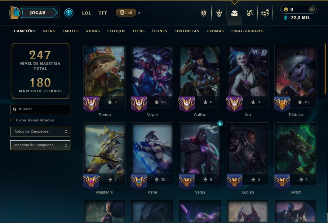 Ouro 2 com 40 Champs e 12 Skins, Maestria 29 de Teemo, 21 de Vayne, 16 de Cailtyn, 12 de Jinx, 12 Skins, 20 Cromas, 92 Ícones, 50 Emotes, 1 Fragmento de skin, 10 de Campeão, 3 Reembolsos e Honra 3.
