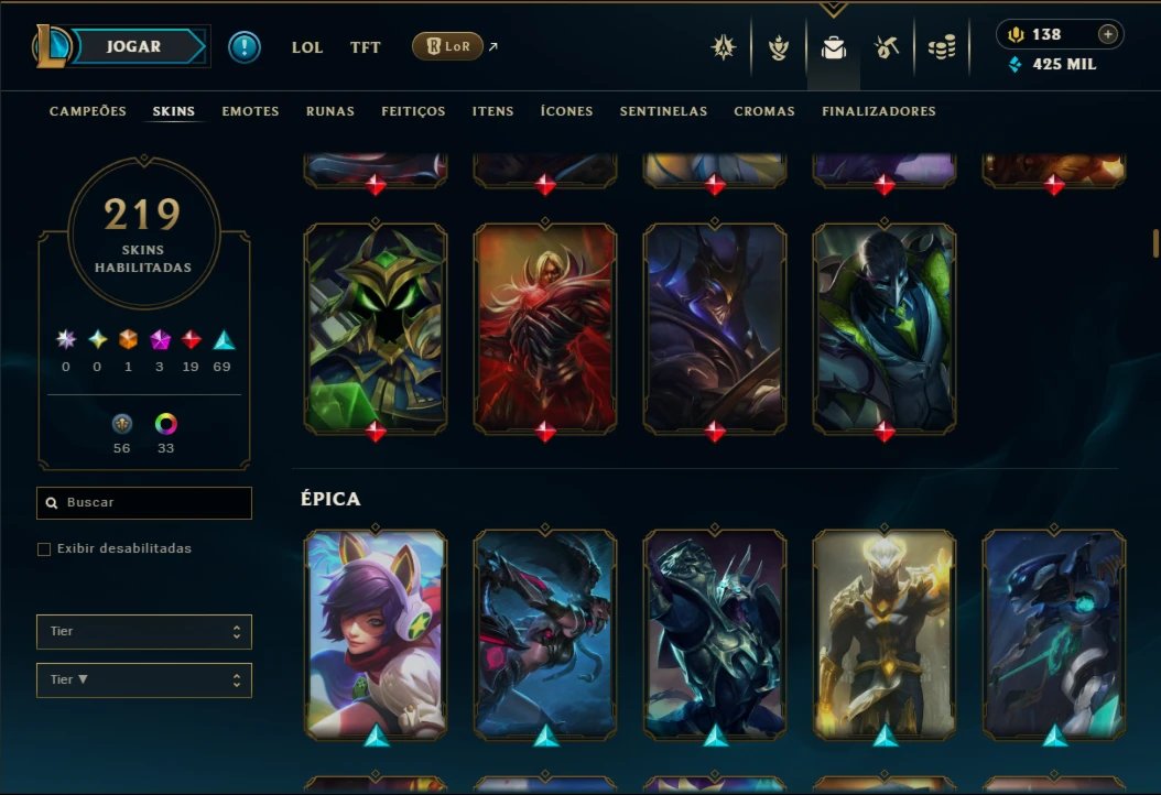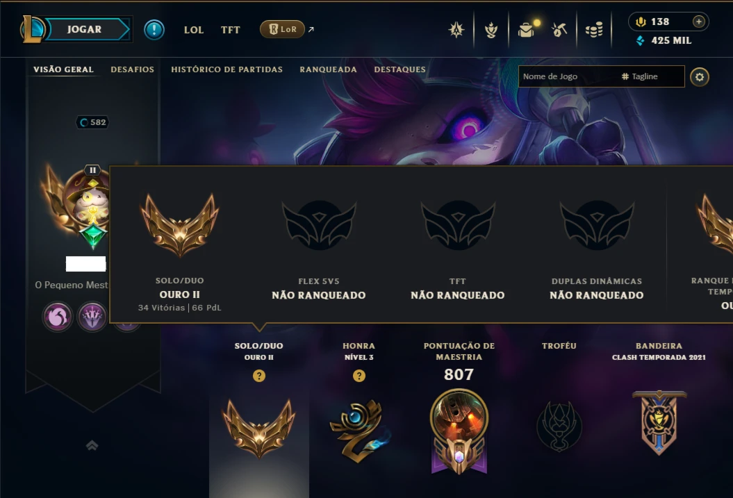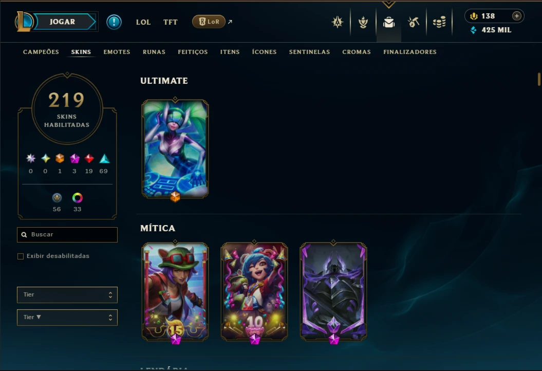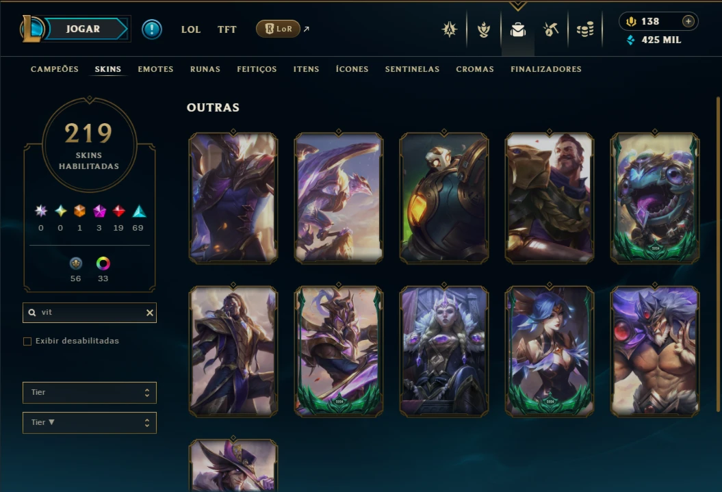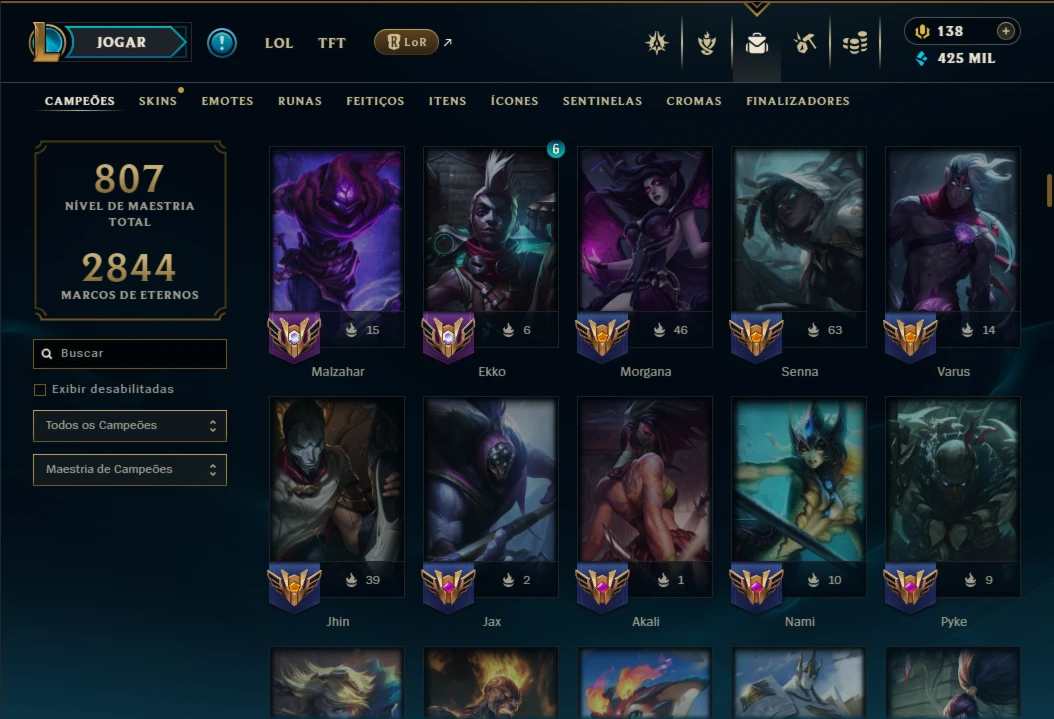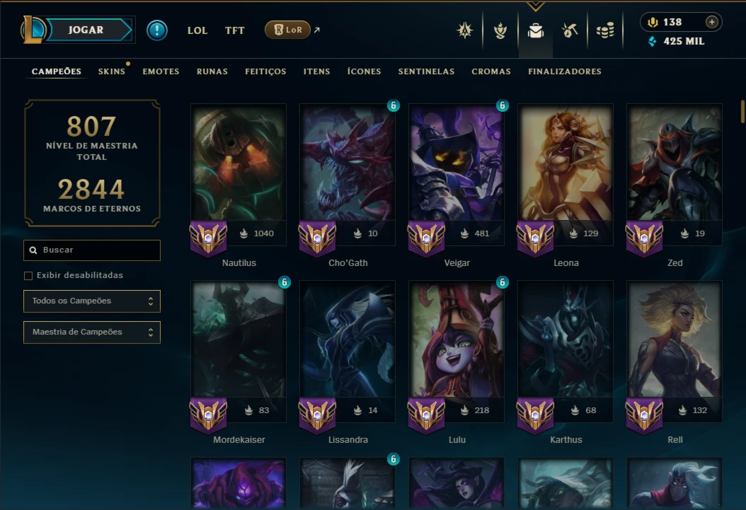 ( MID / JG / SUP ) - ( Nivel 582 ) - Conta Ouro 2 com TODOS os Champs, Maestria 87 de Nautilus, 42 de Cho, 42 de Veigar, 29 de Leona, 22 de Zed, 28 Maestrias acima de 7, 219 Skins, 3 Miticas, 11 Vitoriosas, 425k de EA, 40 Cromas, 401 Ícones, 309 Emotes, 60 Essencias Miticas, 3 Reembolsos e Honra 3.