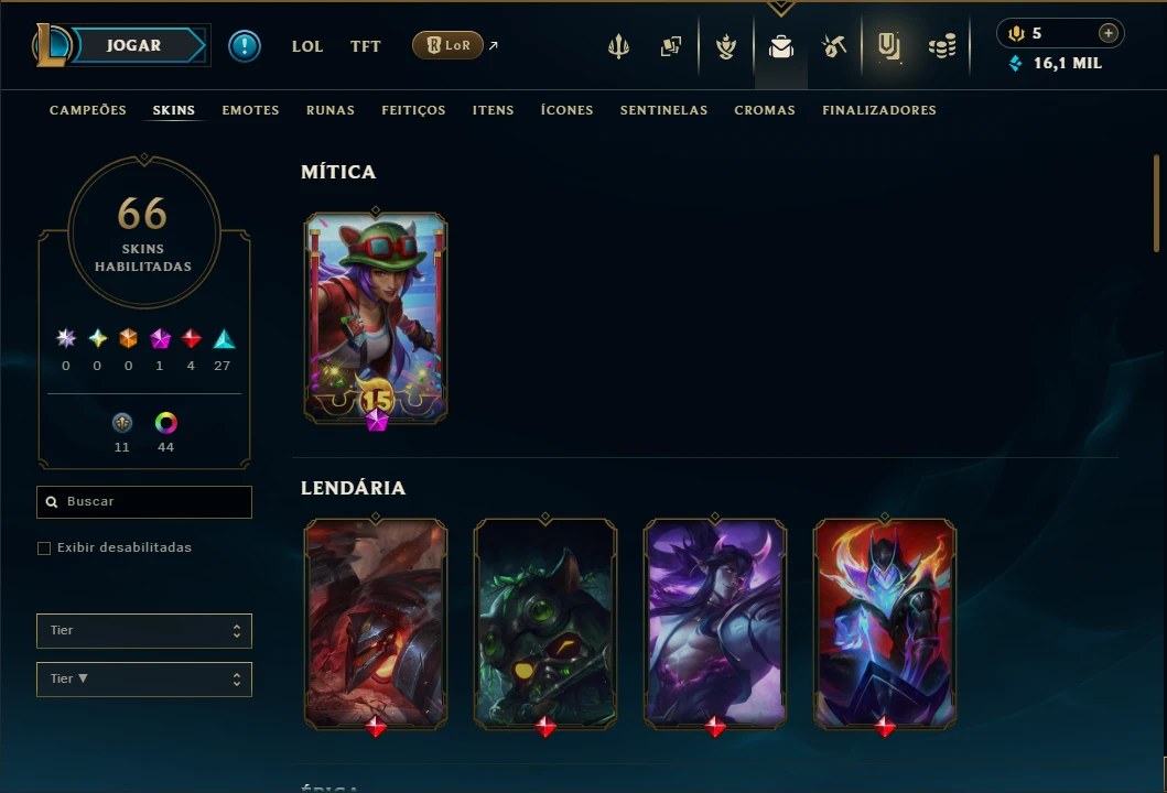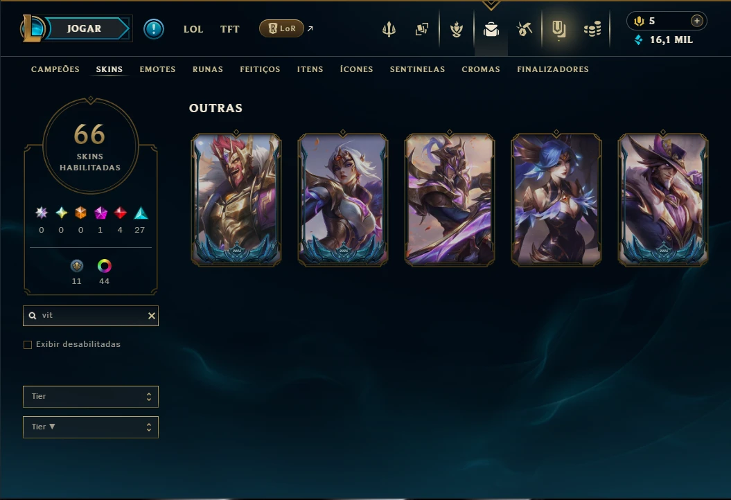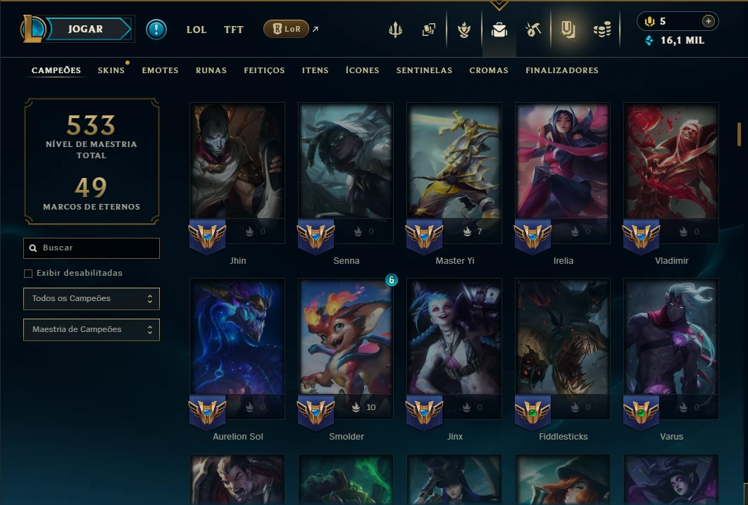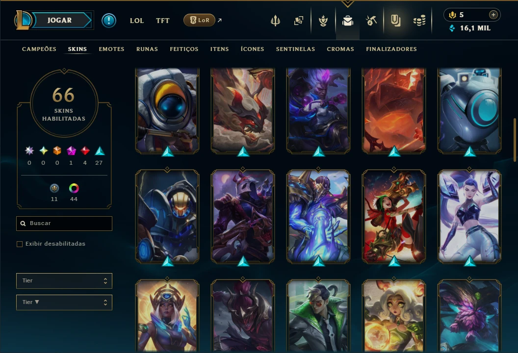Conta Ouro 3 com TODOS os Champs, 18 Maestrias acima de 7, 66 Skins, 5 Vitoriosas, 16k de EA, 44 Cromas, 163 Ícones, 117 Emotes, 2 Reembolsos e Honra 4.