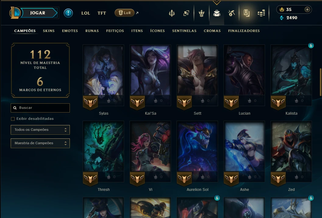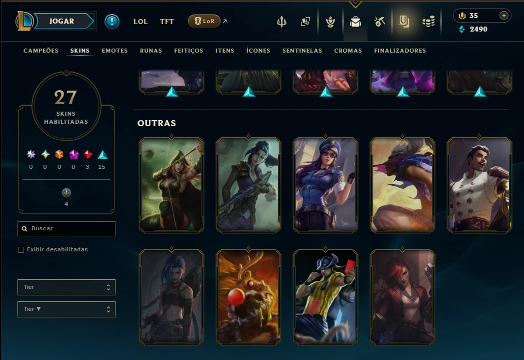 Conta Ouro 4 com 70 Champs e 27 Skins, 48 Ícones, 19 Emotes, 2 Fragmento de campeão, 2 Reembolsos e Honra 3.
