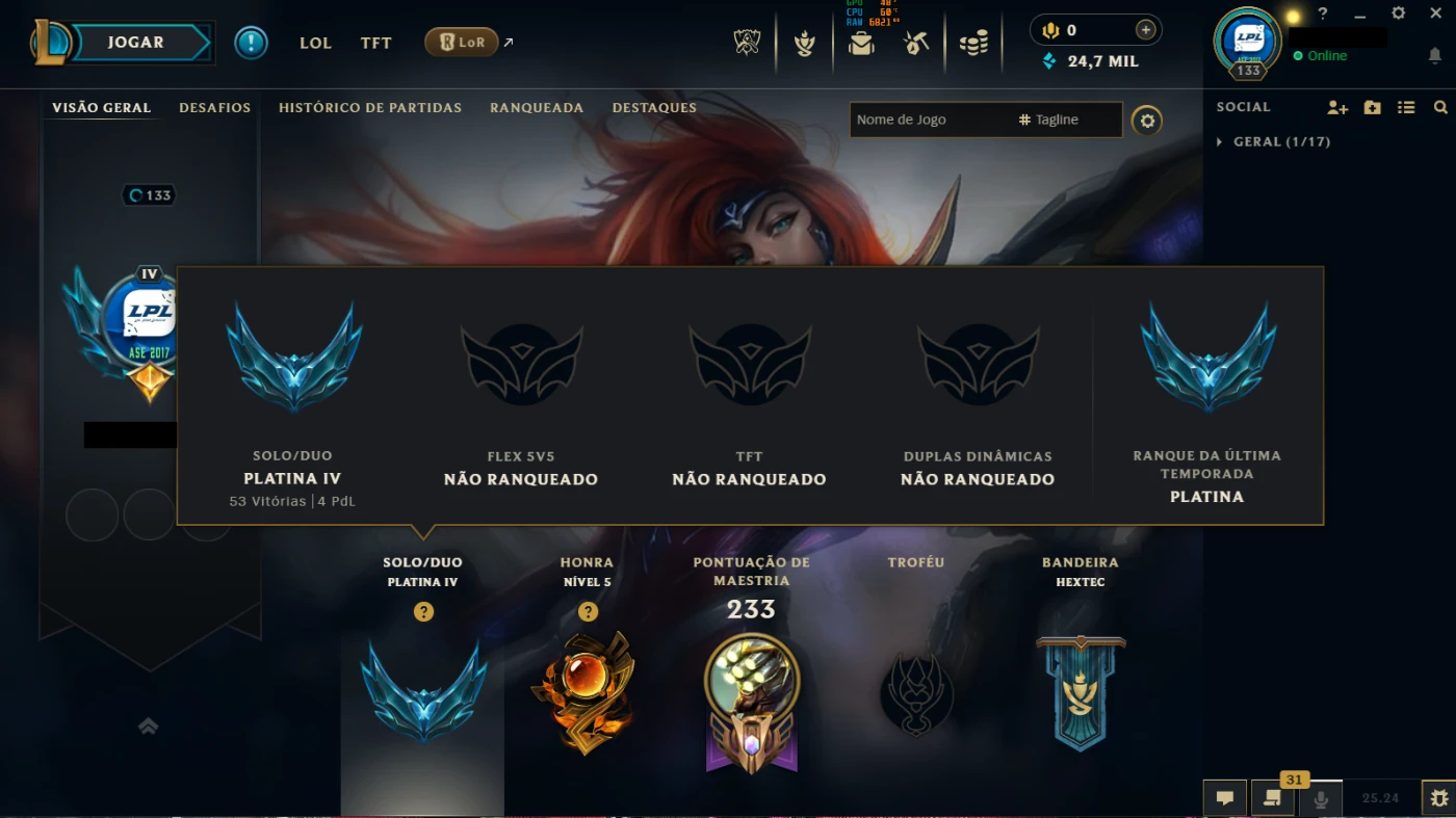 conta league of legends, platina, lvl 133, 87 champs, 52 skins, qualquer duvida entrar em contato. pronta entrega.