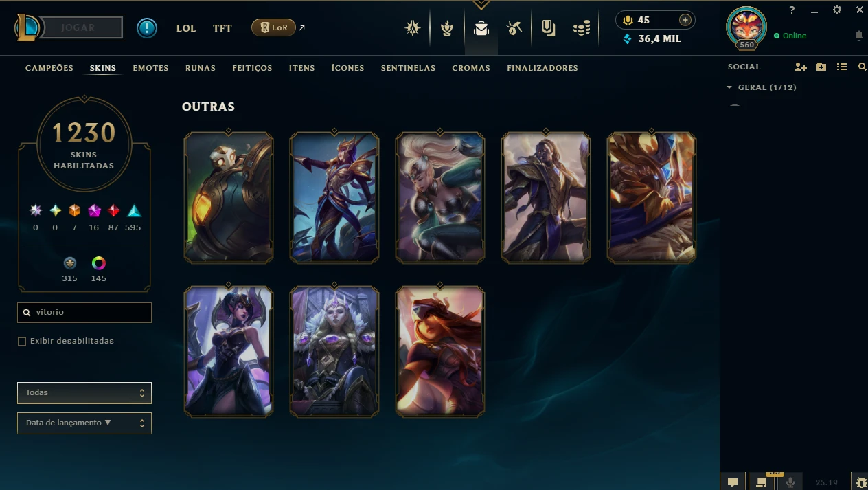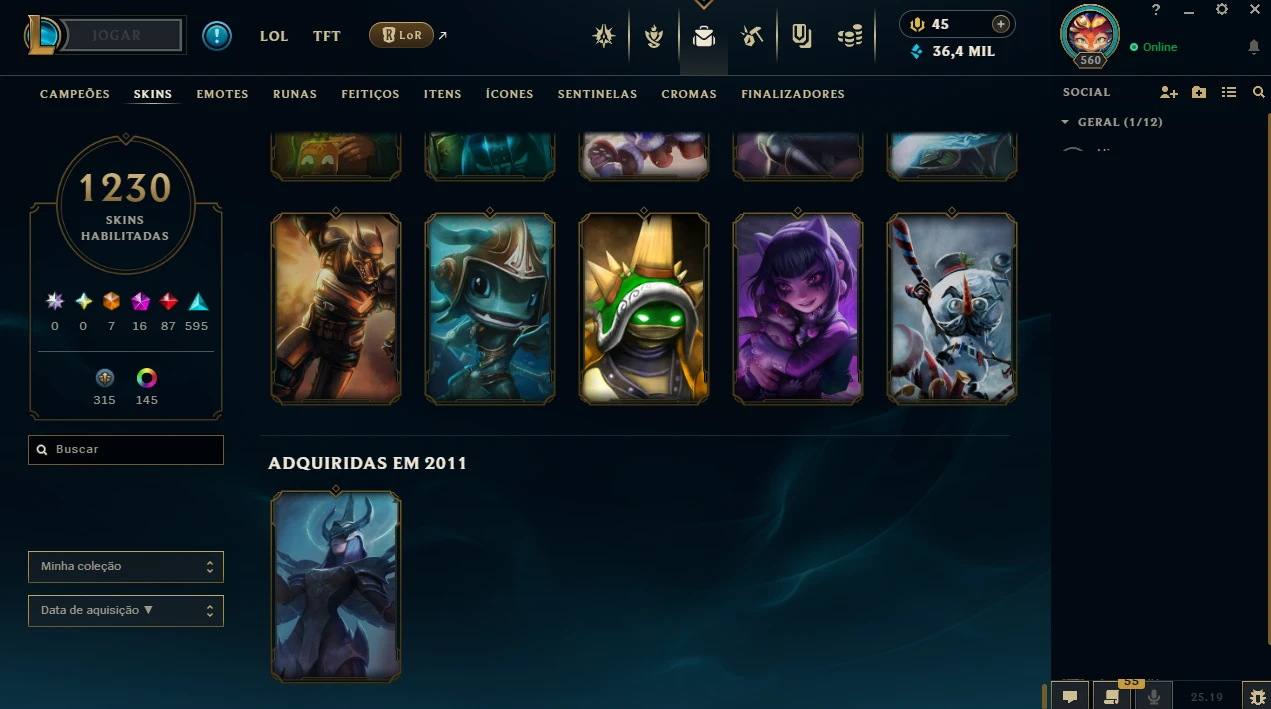 Tem 1230 SKINS, a conta é de 2011 e possui skins como Kayle Juíza, Janna Vitoriosa e Rammus Rei.