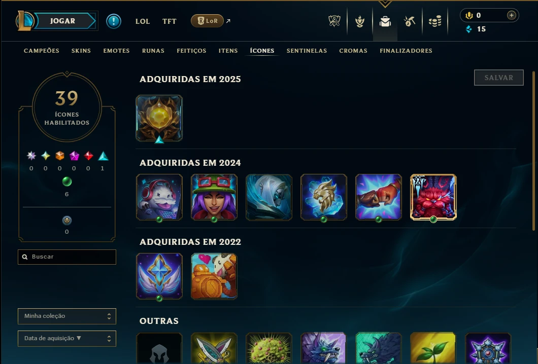 Conta Unranked com 30 Champs e 6 Skins, 3 Cromas, 39 Ícones, 11 Emotes, 1 Fragmento de skin, 1 Reembolso e Honra 3.