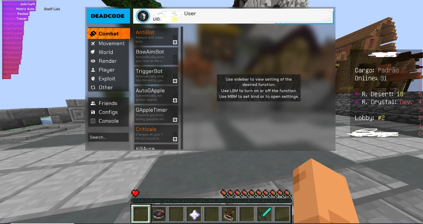 Cheat muito bom para quem quer economizar , por que tem muitas funçoes bypass , kill aura legit e range grudando a mira no seu inimigo