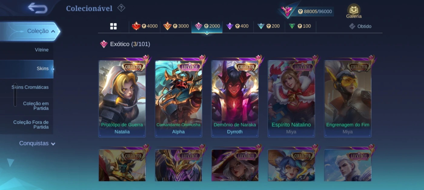 - Skins Collector: Dyrroth (Demônio de Naraka), Natalia (Protótipo de Guerra).