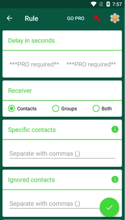 Criar uma resposta automatizada é muito simples. A primeira coisa que você precisa fazer é escrever sua mensagem de resposta para qualquer texto que você receber. Depois de configurar esta primeira etapa, você poderá adicionar um atraso de vários segundos à resposta ou a possibilidade de responder apenas em determinados dias e em determinados horários. Alguns dos recursos mais interessantes estão disponíveis apenas na versão PRO do aplicativo.