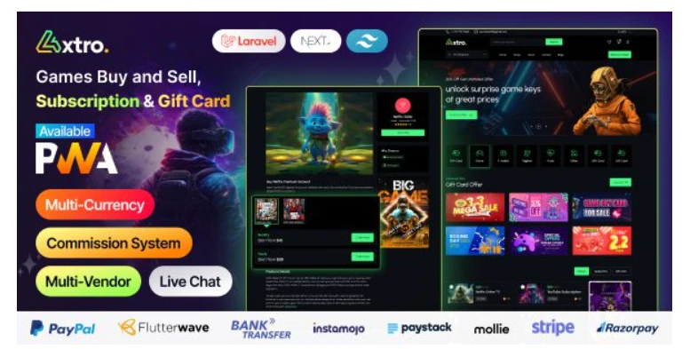 Axtro – Games Buy and Sell, Subscription & Gift Card Laravel Script é uma poderosa plataforma multivendedor projetada para compra e venda de assinaturas de jogos, cartões-presente e chaves de licença.