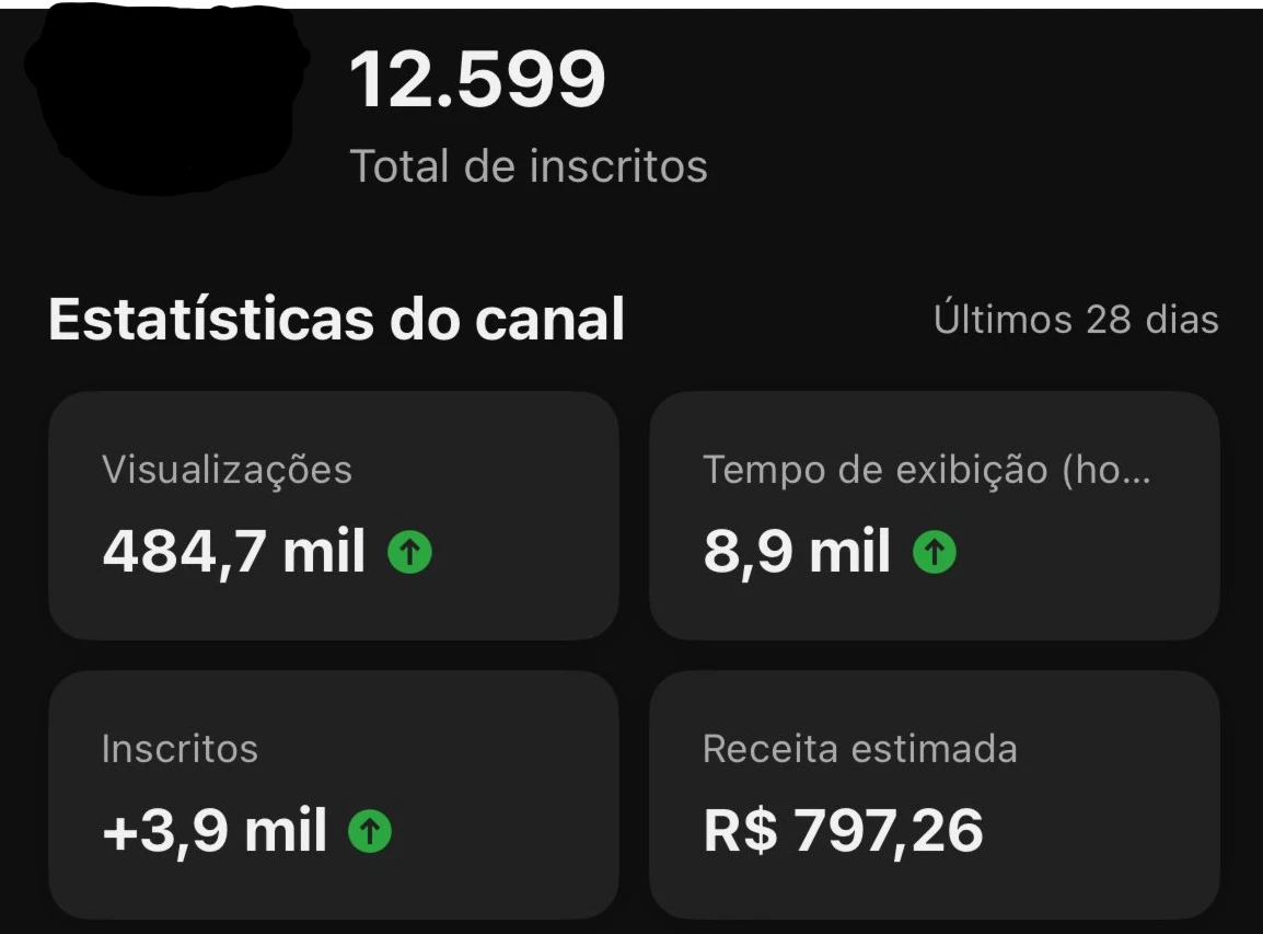 ✔️ Nos últimos 28 dias: +3,9 mil inscritos, 484,7 mil views e 8,9 mil horas assistidas.