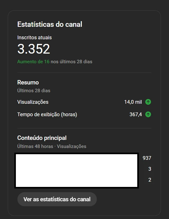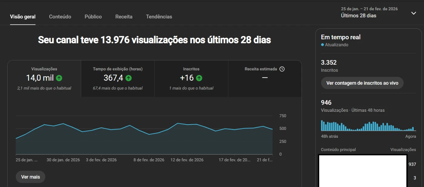 • Horas de Exibição (Último ano): 3.900 horas (Praticamente o requisito de 4k para monetização já batido!).