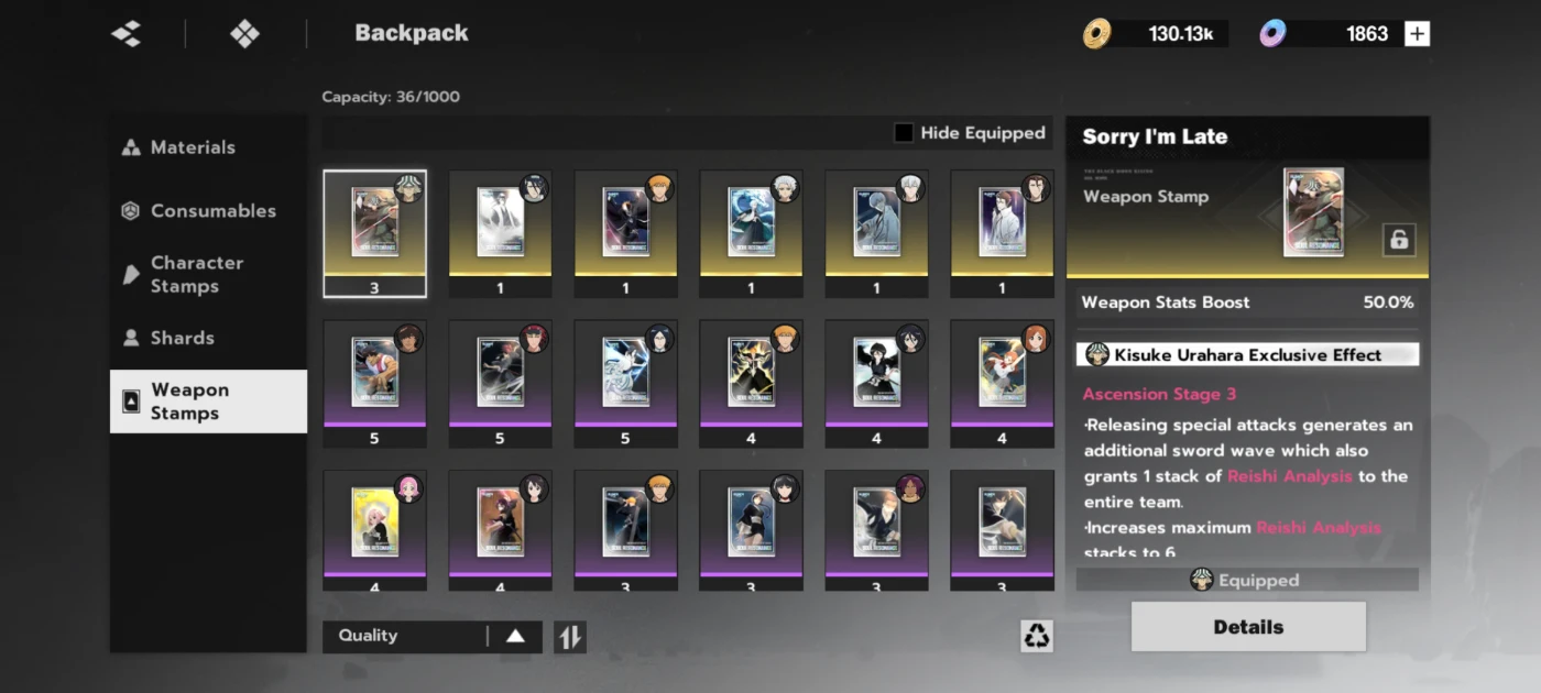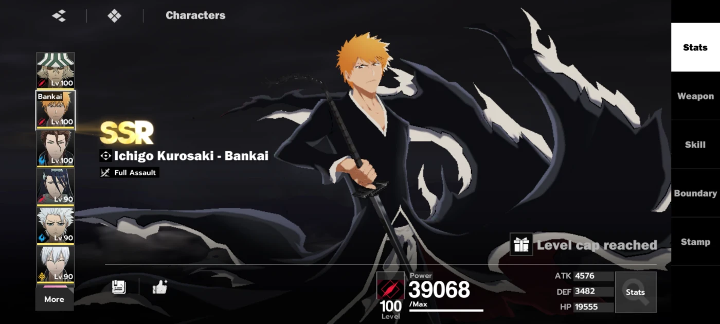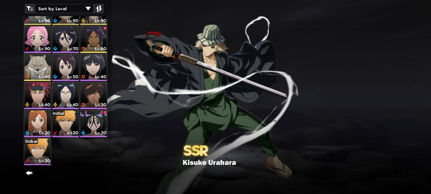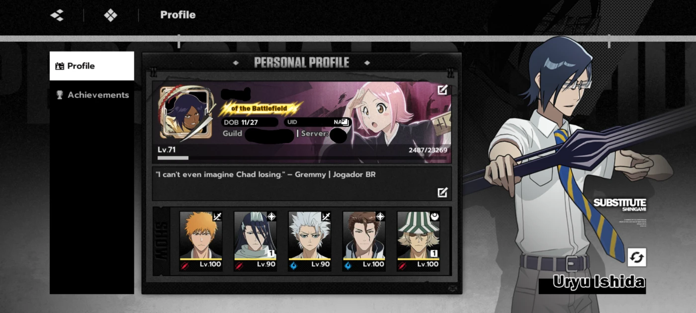 Conta Bleach Soul Resonance no level 71 com 8 personagens SSR (inclui todos os personagens limitados + armas limitadas nessa data 20/01), tendo personagens upados até o nível máximo com ótimos recursos. A conta está muito boa e foi upada com muito carinho desde o lançamento, jogando todos os dias. Sou líder de uma guilda nível 4 e tenho times completos para o tipo slash e espírito. Abaixo listo os meus personagens mais fortes para referência:
