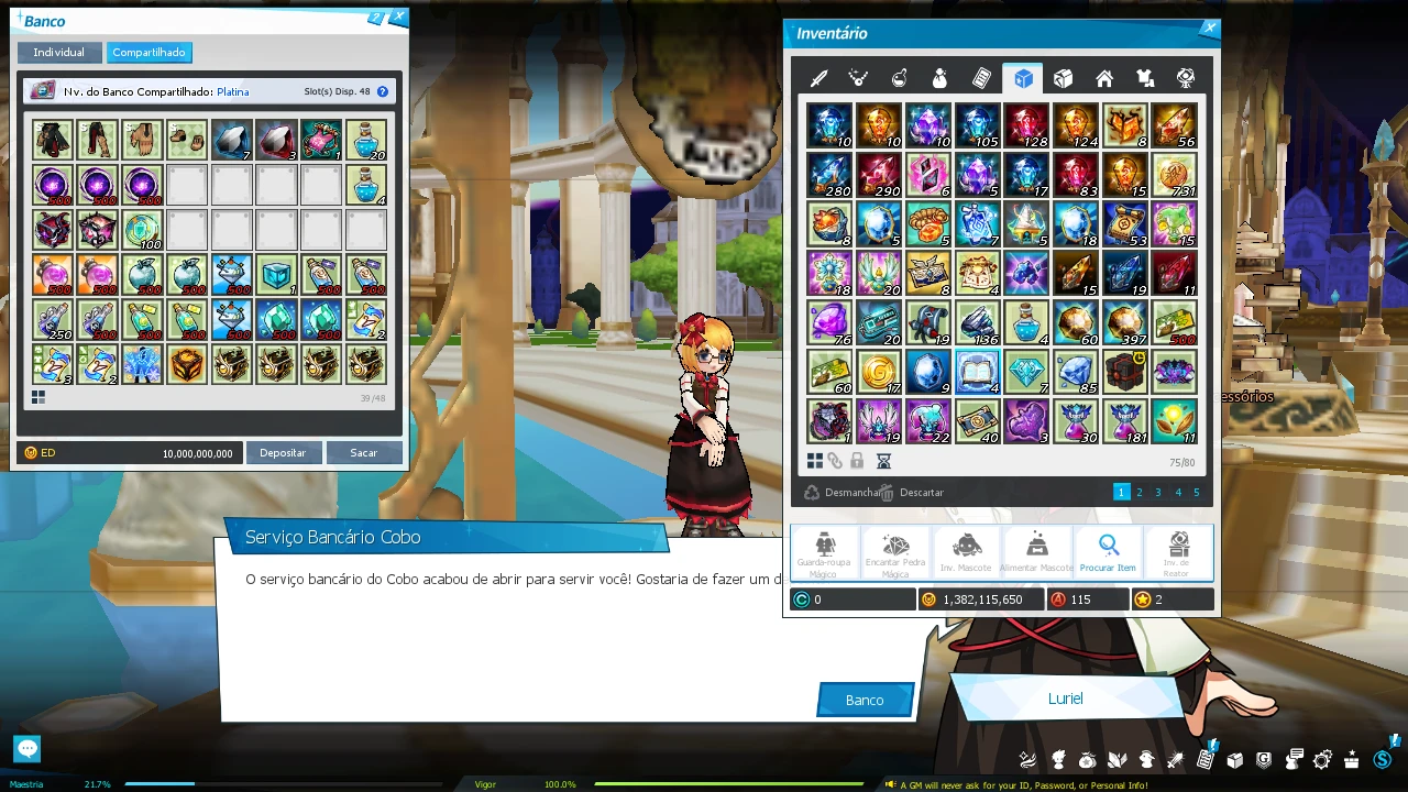 Servidor INTIMPORTANTE: Está rolando um evento de boost de CP no servidor (vai até o início de abril). ESTE EVENTO NÃO FOI ATIVADO NESSA CONTA. O evento dá uma arma Soa +11 e um set tenebros +11, além de uns itens temporários (títulos, visuais, etc.) pra qualquer char da conta