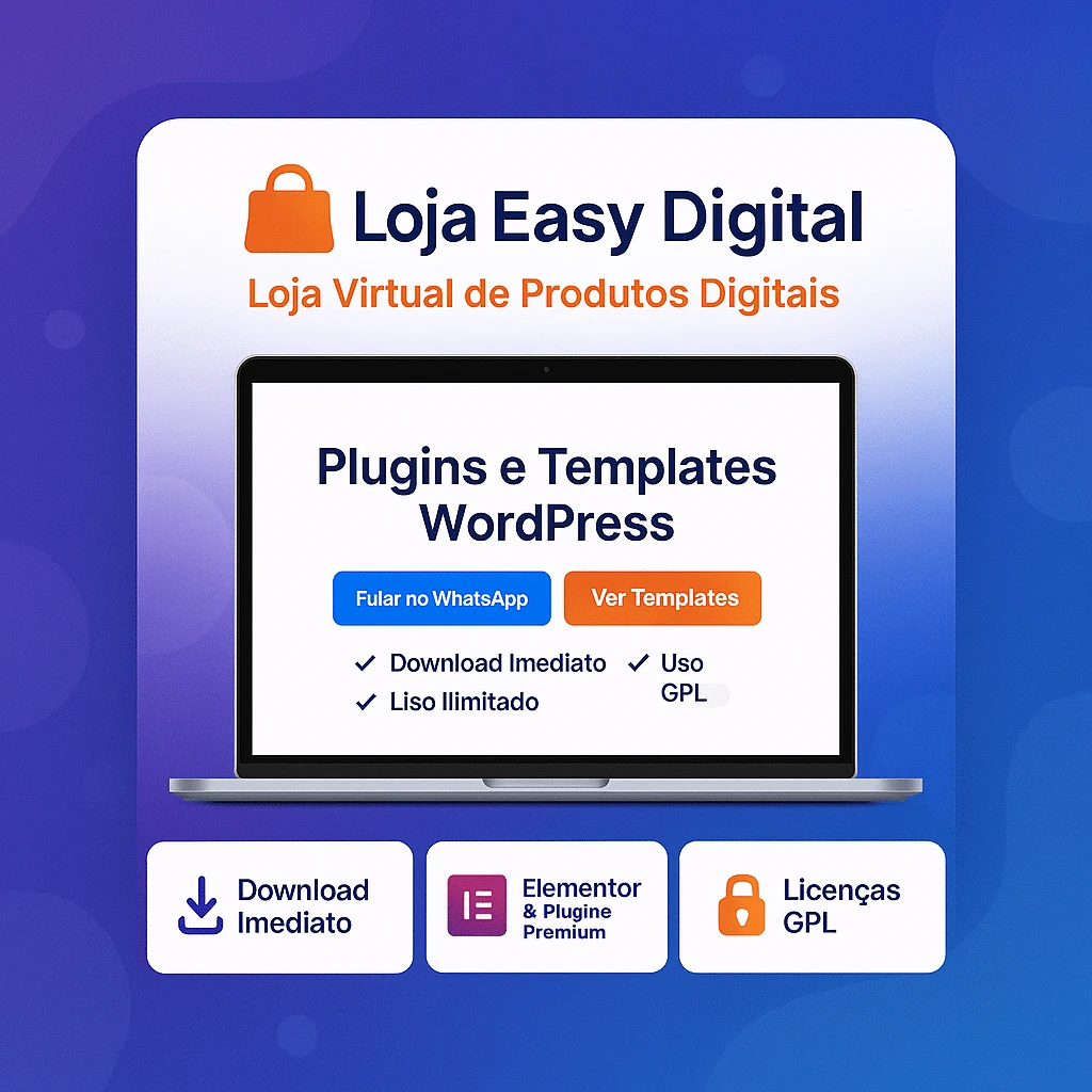 Crie sua loja virtual para produtos digitais com o modelo Loja Easy Digital para WordPress. 100% editável, checkout rápido e entrega automática de arquivos. Ideal para e-books, cursos, fotos, plugins e muito mais.