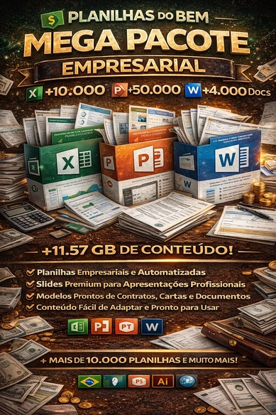 O Planilhas do Bem – Mega Pacote Empresarial é uma coleção completa de ferramentas profissionais desenvolvidas para otimizar a gestão empresarial, organização financeira, apresentações e documentação corporativa. Este pacote reúne milhares de arquivos prontos e editáveis para uso no Excel, PowerPoint e Word, permitindo que empresas, empreendedores e profissionais aumentem sua produtividade e eficiência.