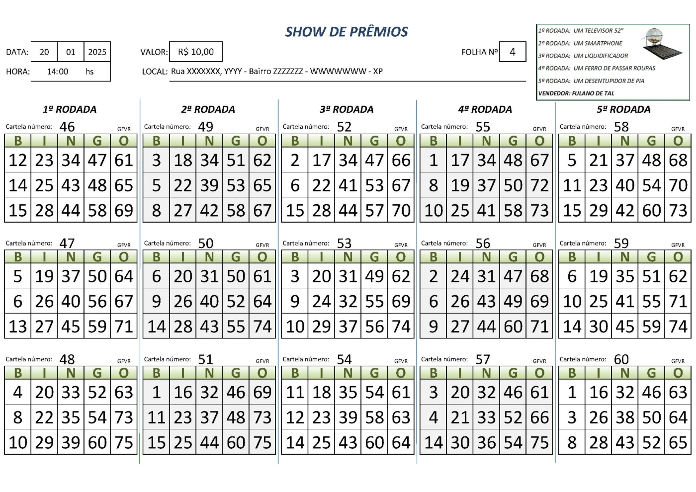 Este pacote inclui diversas planilhas eletrônicas do EXCEL capazes de gerar QUANTAS CARTELAS VOCÊ DESEJAR em vários modelos e na quantidade de números que preferir de acordo com suas pedras ou seja, o total de 60, 75, 90 etc. A distribuição dos números nas colunas de cada tabela é você que escolhe, se preferir. Assim você também pode controlar as cartelas que terão restrição de ganho.