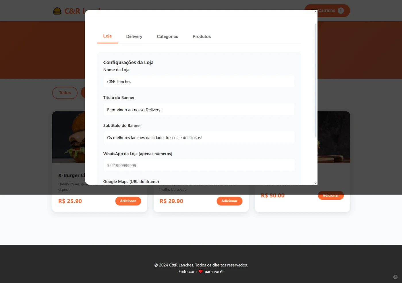 ✔️ Painel administrativo completo — edite nome, frases banners, categorias, produtos, preços, fotos, taxas, horários e muito mais.