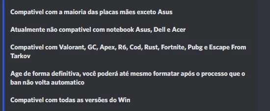 Compativel com Valorant, GC, Apex, R6, Cod, Rust, Fortnite, Pubg e Escape From Tarkov Age de forma definitiva, você poderá até mesmo formatar após o processo que o ban não volta automatico Compativel com todas as versões do Win