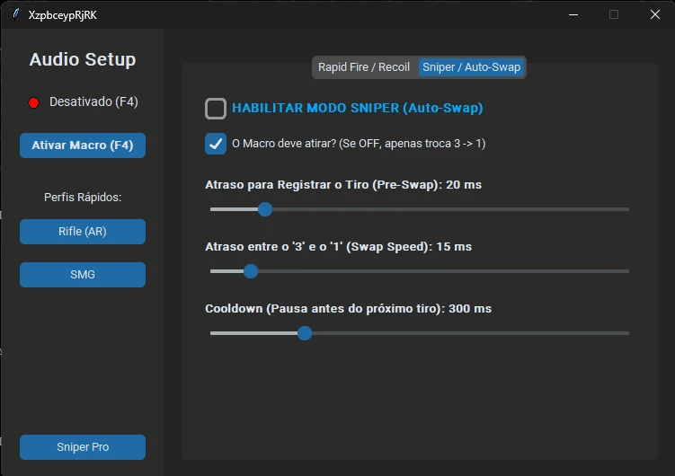 Muito simples. O programa já vem com perfis pré-configurados para Sniper, Rifle e SMG. Basta abrir, ativar com o F4 e jogar. Se quiser ajustar os MS, o menu é totalmente intuitivo.