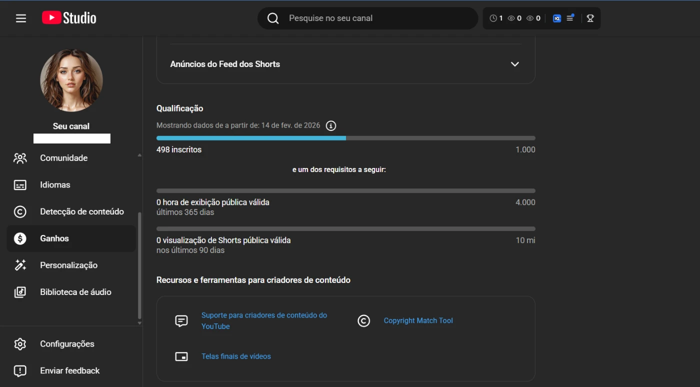 Canal Youtube 498 inscritos (NÃO MONETIZADO)