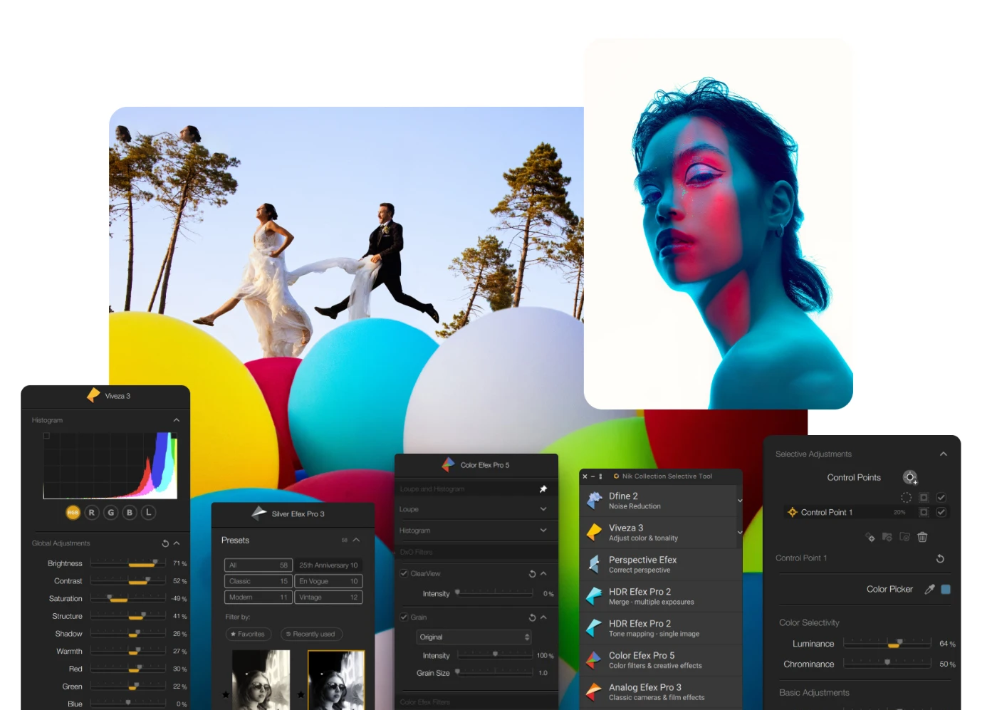 Com os plugins da Suite Nik você pode ajustar a nitidez das imagens em fotos digitais, realizar correção de cor, retoques, styling, se livrar de qualquer tipo de ruído na imagem, brilho, ajustar o contraste e saturação de cor de objetos individuais ou áreas da fotografia.
