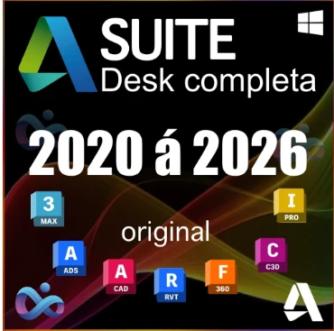 Autocad, Revit, 3DS Max, Maya, Civil 3D, Navisworks, Advance Steel, Alias Studio, CFD, Fabrication, Vred, Fabrication, CADmep, CAMduct, ESTmep, Factory design,Feature CAM, Vred, Inventor Pro, Fusion 360, Inventor CAM, Inventor Nastran, Inventor Nesting, Inventor Tolerance, Arnold, Formit, Recap Pro, Recap Photo, Infraworks, HSM Works, Motion Builder, Mudbox, Netfabb, Point Layout, CFD, Power Inspect, Power Shape, Robot, Flame, Vehicle, Smoke, Electrical, Mechanical, Architecture, Map 3D, Map, Plant 3D, Raster Design, Vault, Eagle 360, Moldflow, Civil Granding, Civil Project, nas versões de 2020 a 2026.