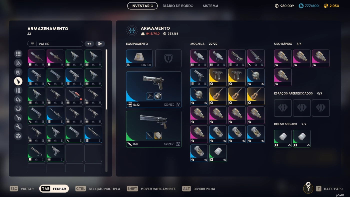 54 Esquemas ativados incluindo Vulcão, Lince, Injeção Vita, venator, todas armas lendárias, roxas e +