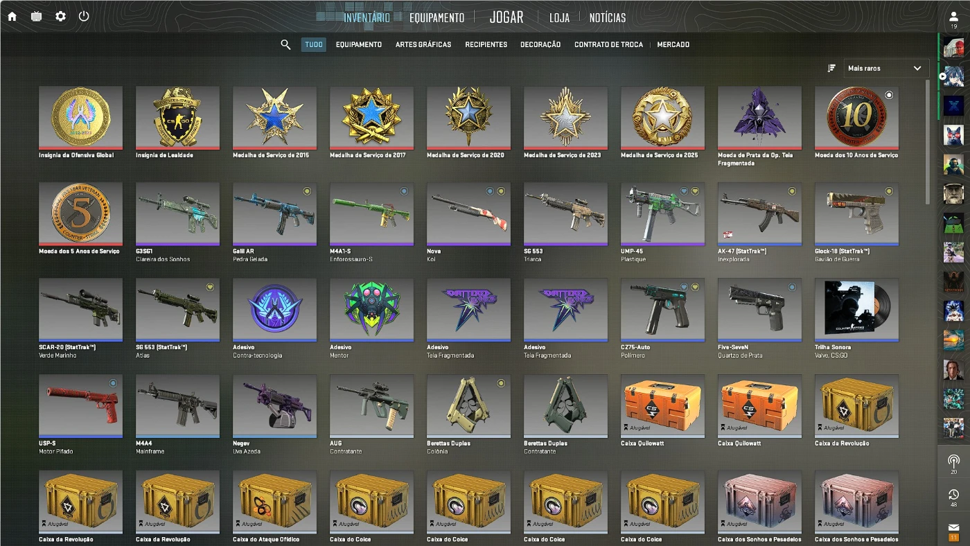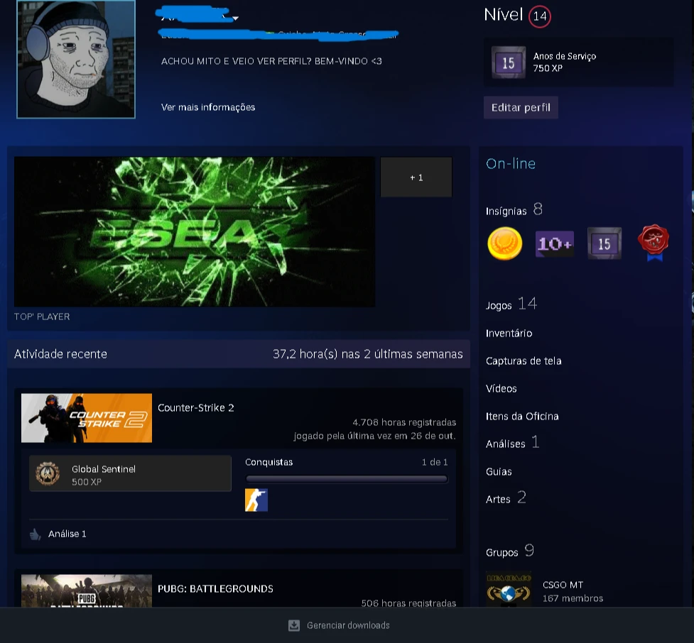 STEAM COM 15 ANOS DE SERVIÇO 4,6 MIL HORAS DE CS2, 500 HORAS DE PUBG, 1800 HORAS DE CS 1.6, TODAS MEDALHAS DE SERVIÇO DESDE 2015. NUNCA FOI TOMADO BAN. VARIAS CAIXAS E ARMAS NO IVENTARIO.
