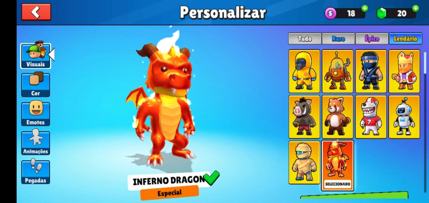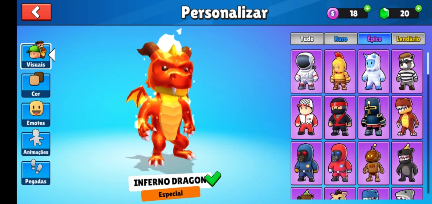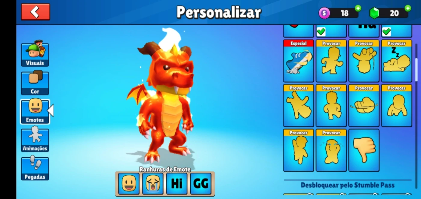 1 skin especial, 3 emotes especiais e uma variedade de emotes, muitas pegadas e animações