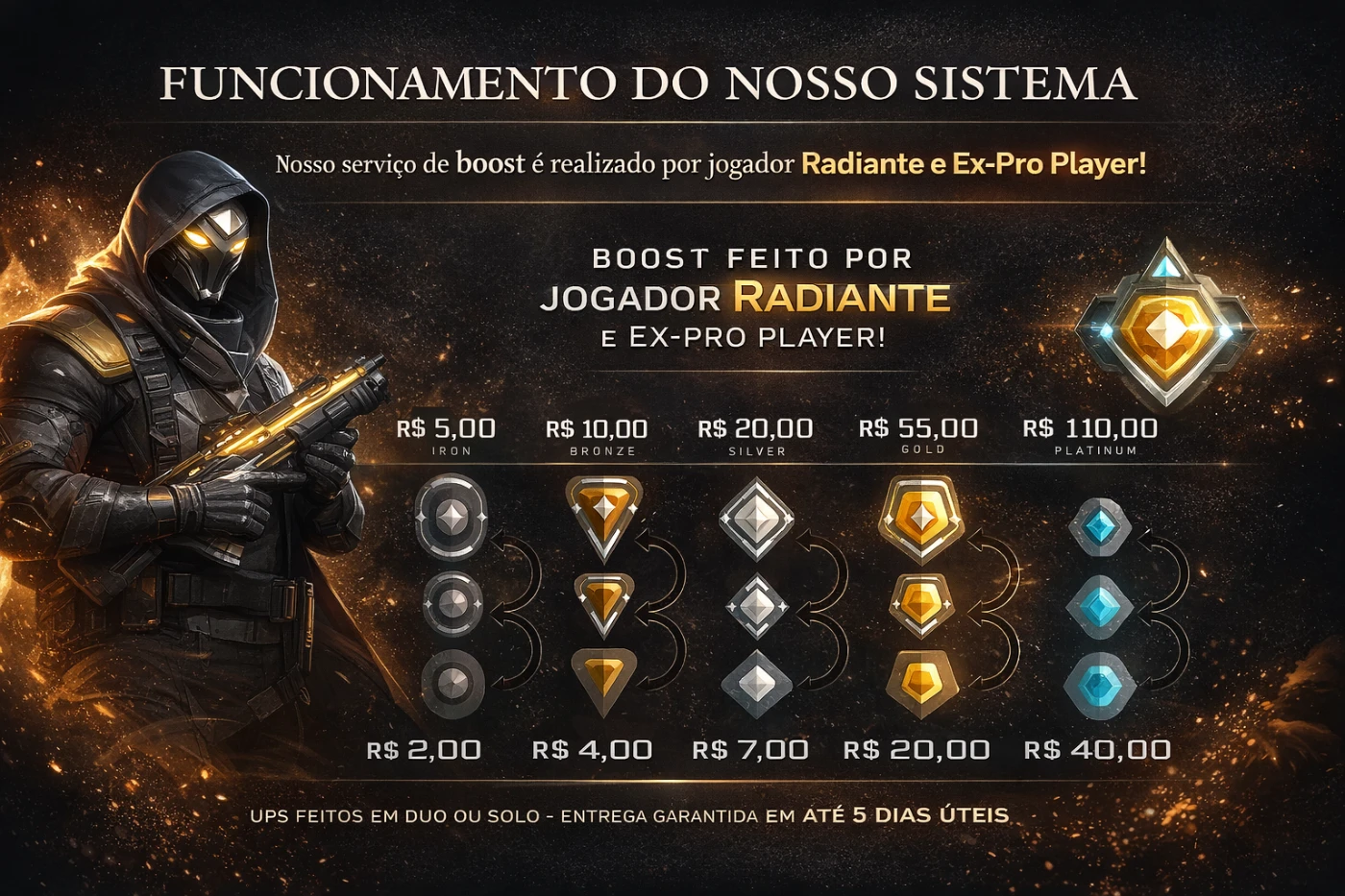 Elo Job Valorant com preços acessíveis — confira a tabela completa na imagem do anúncio.